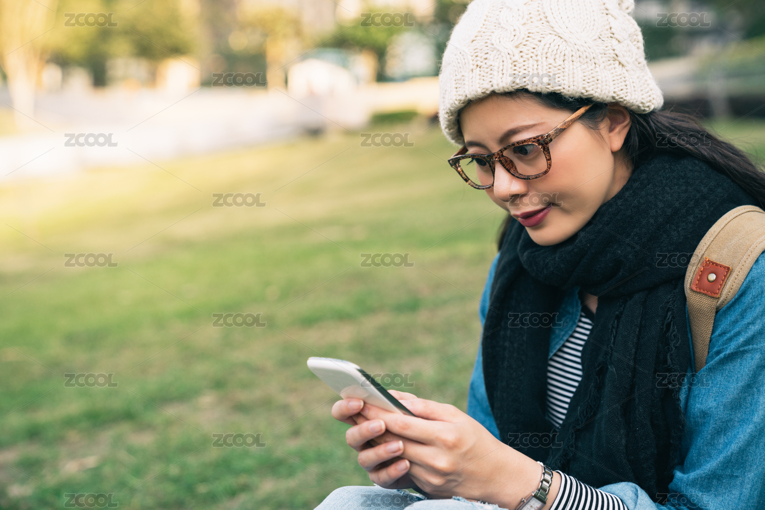美丽的亚洲女孩发短信消息,并在阳光明媚的温暖日子在冬季。