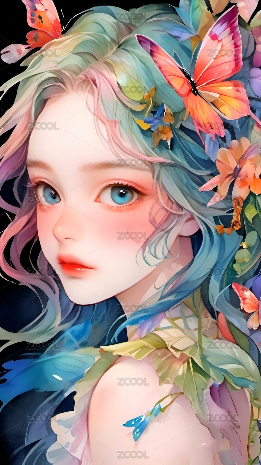 唯美水彩蝴蝶少女插画