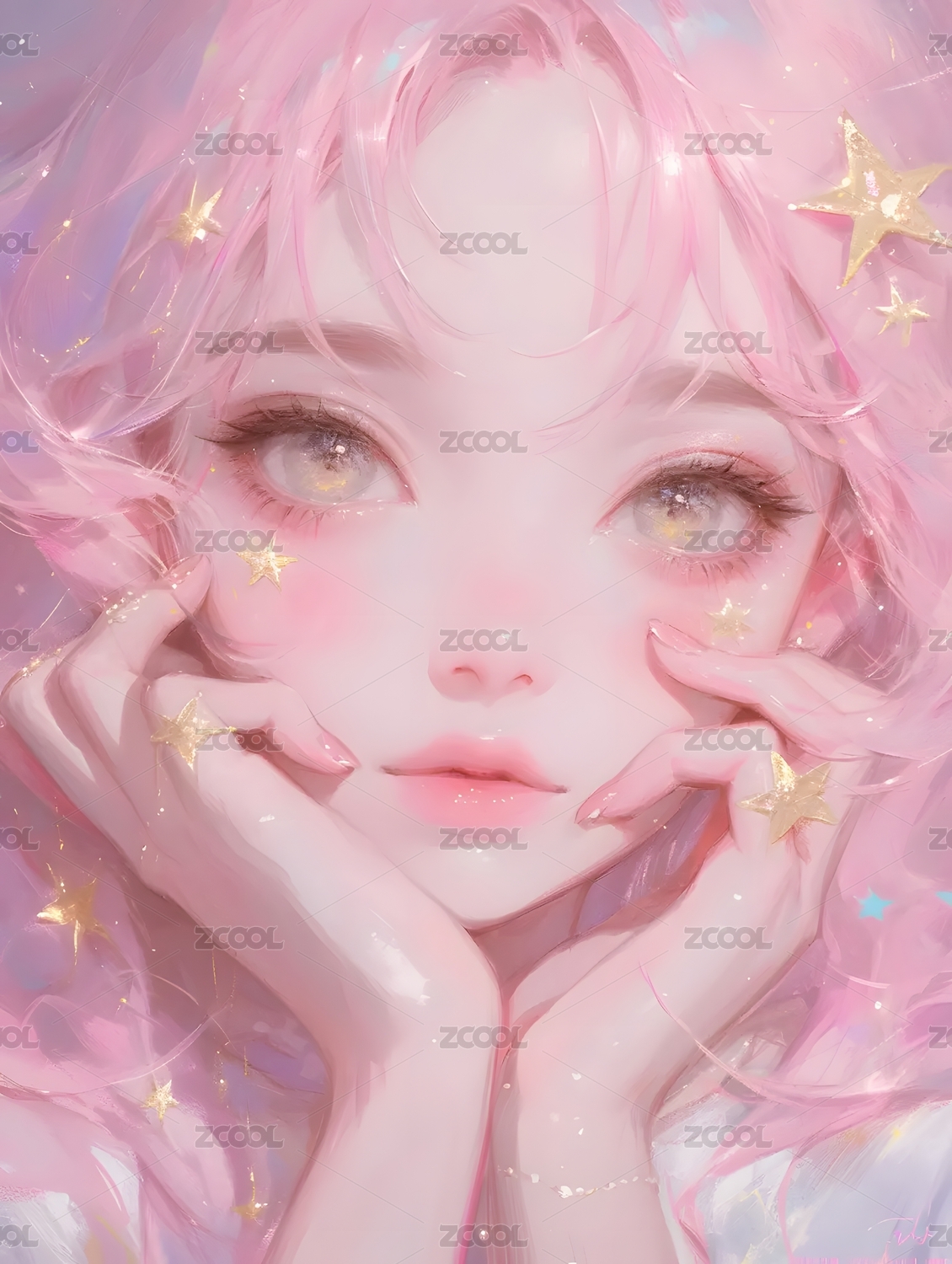 少女,封面,粉紫调,粉头发,油画水彩