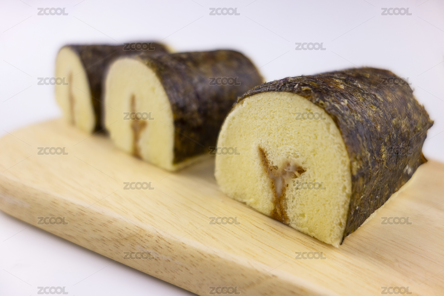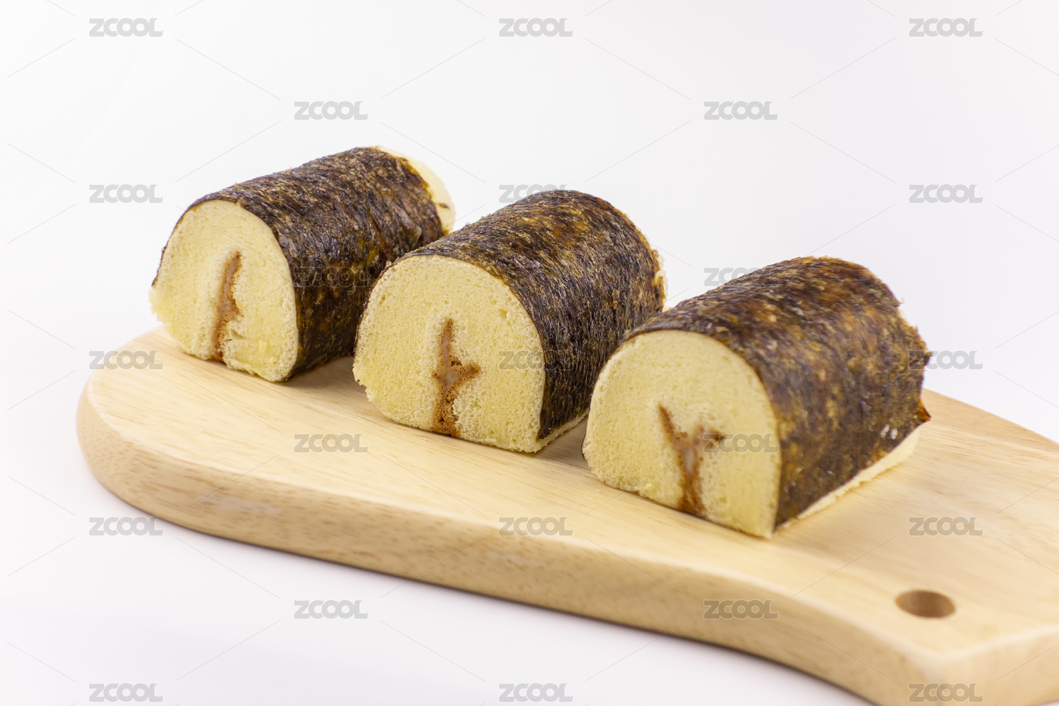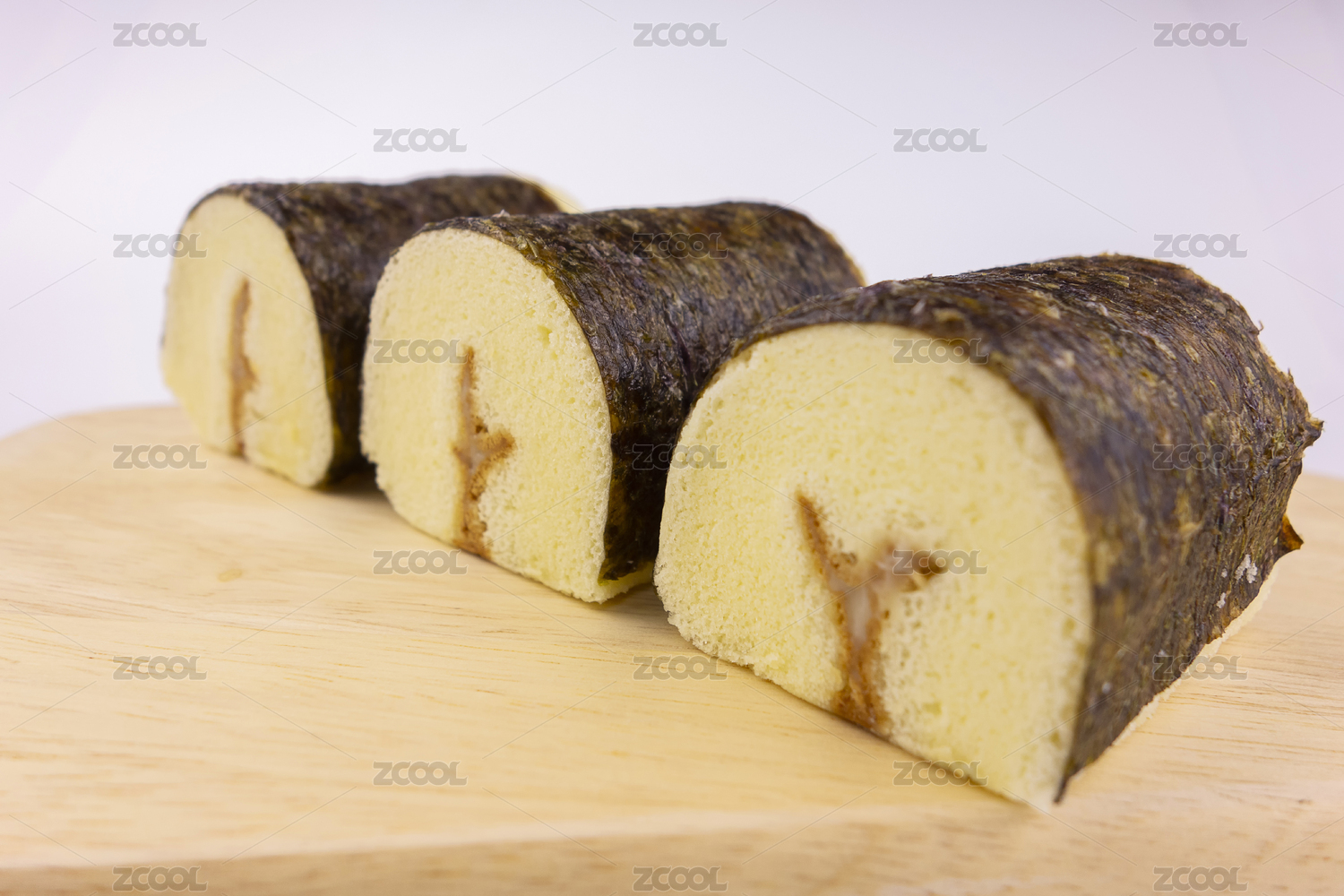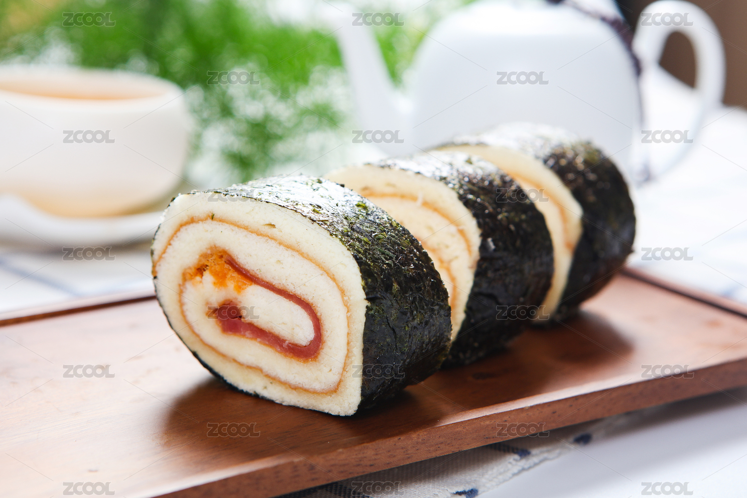 桌面上的白色陶瓷盘子里的紫菜蛋卷