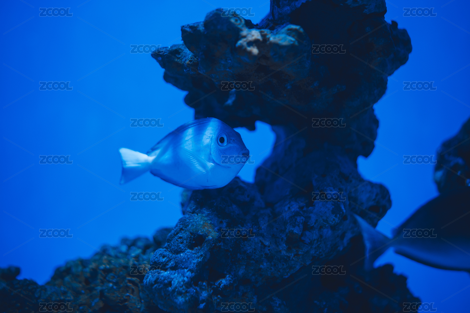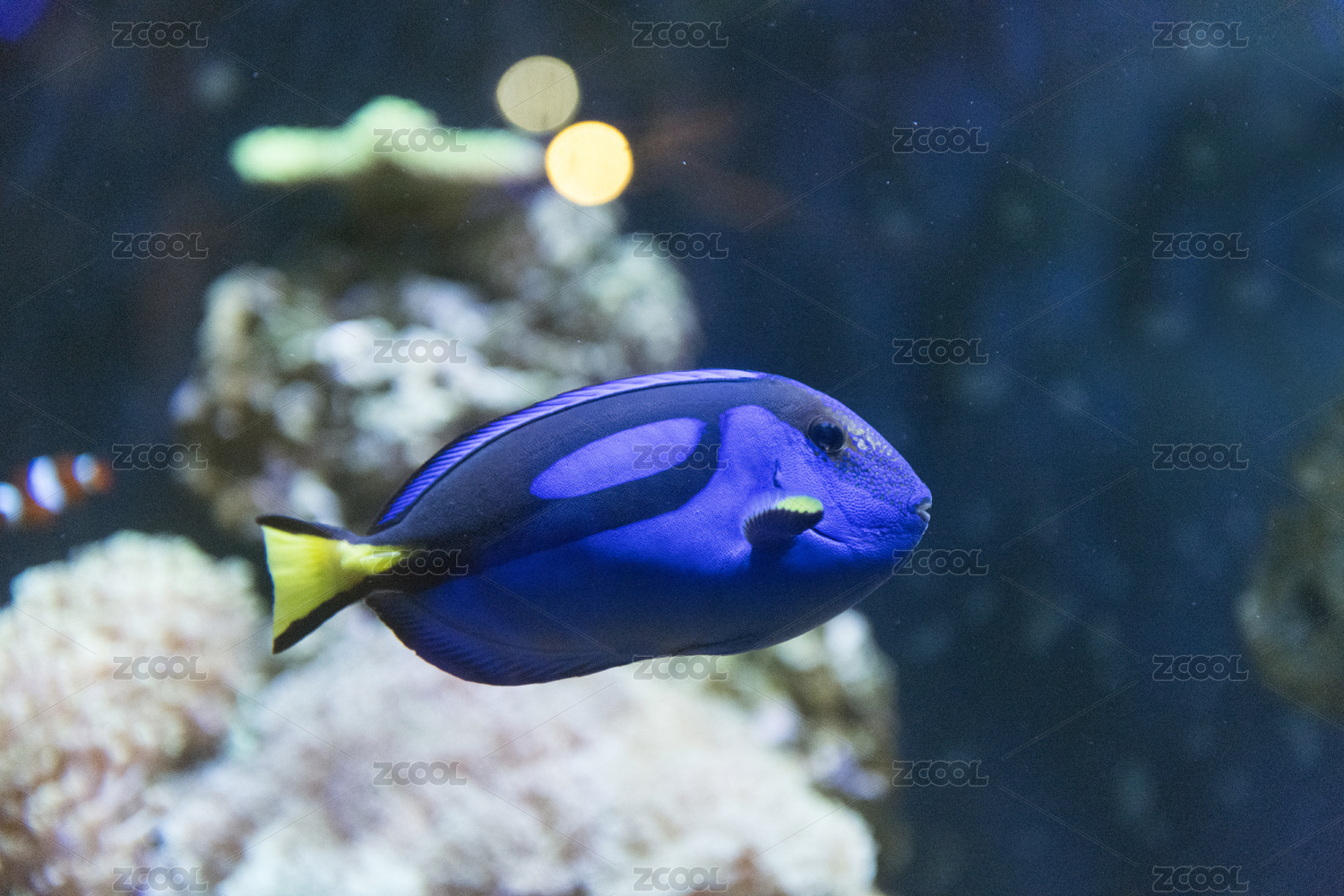 正在游动的蓝色身体带有深色花纹的蓝唐王鱼