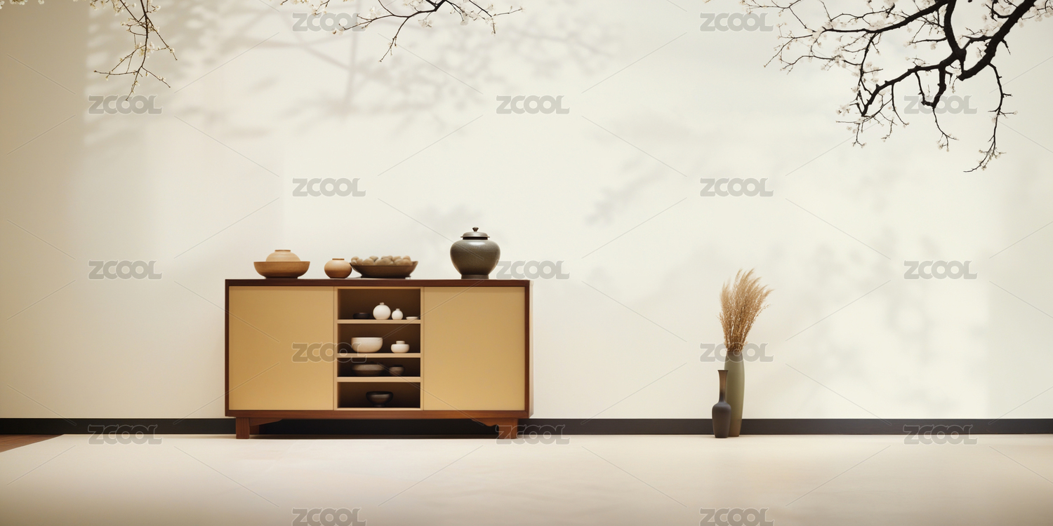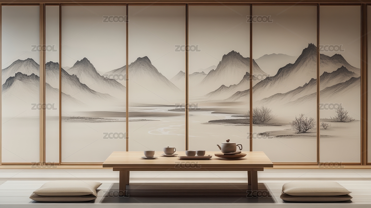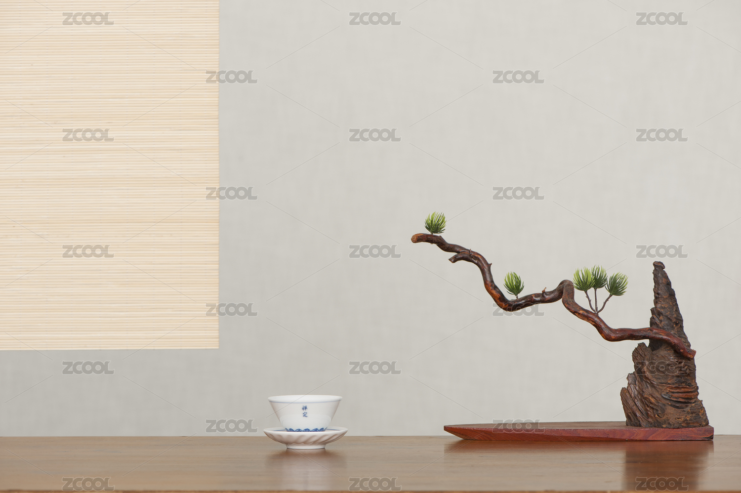 中国画风格,茶帘下面的桌面上放着一个茶杯,边上放着一个手工艺术品