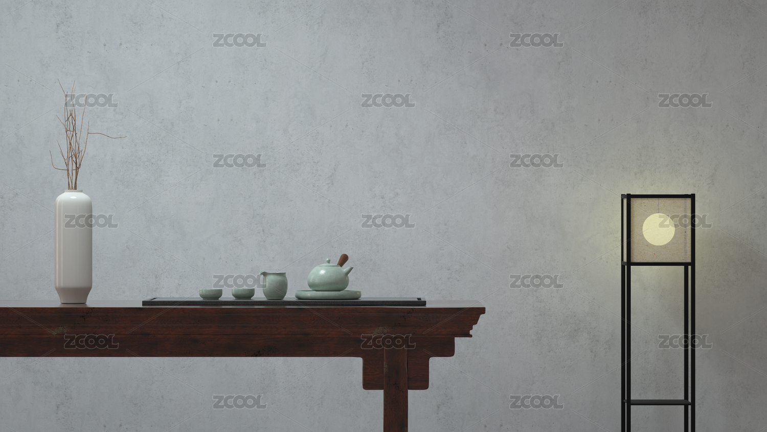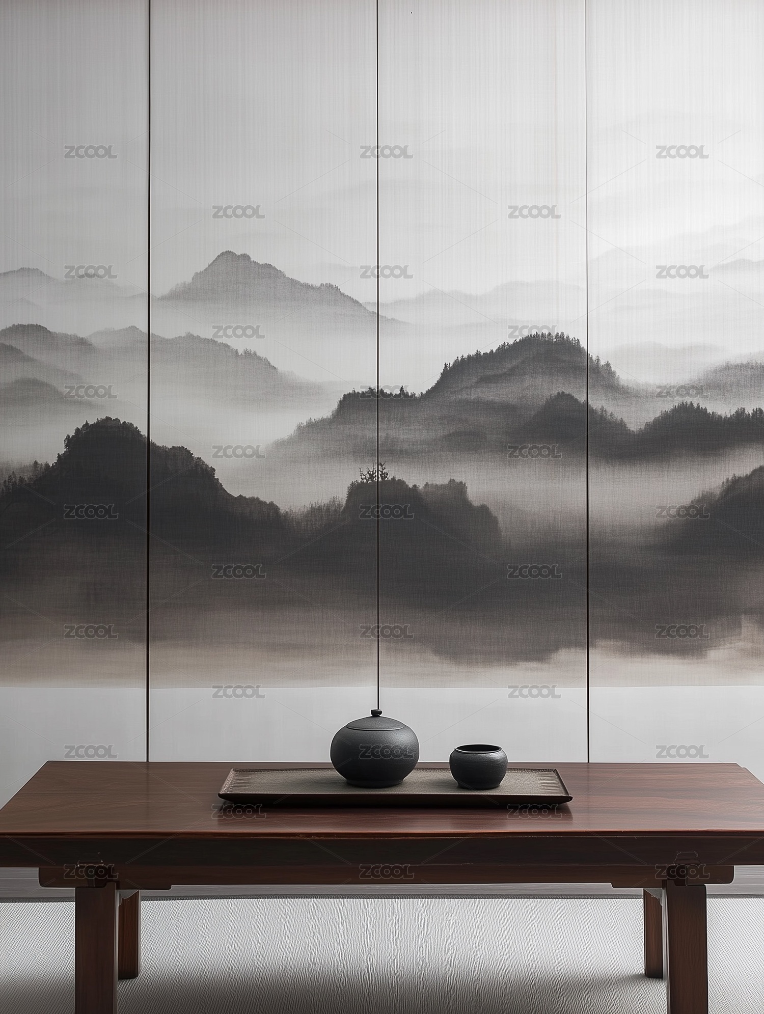 新中式室内书法台,木桌上摆放毛笔架、镇纸、茶壶摆件