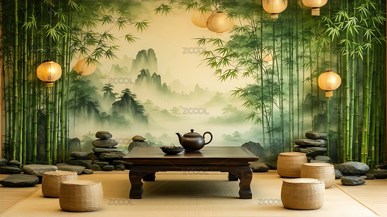 中国画风格,茶帘下面的桌面上放着两个茶杯,还有一件手工艺品