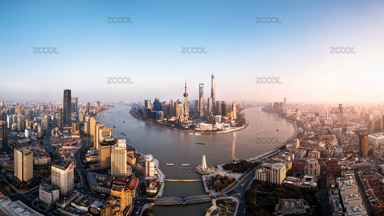 航拍日落时的中国上海市中心黄浦江沿岸风光