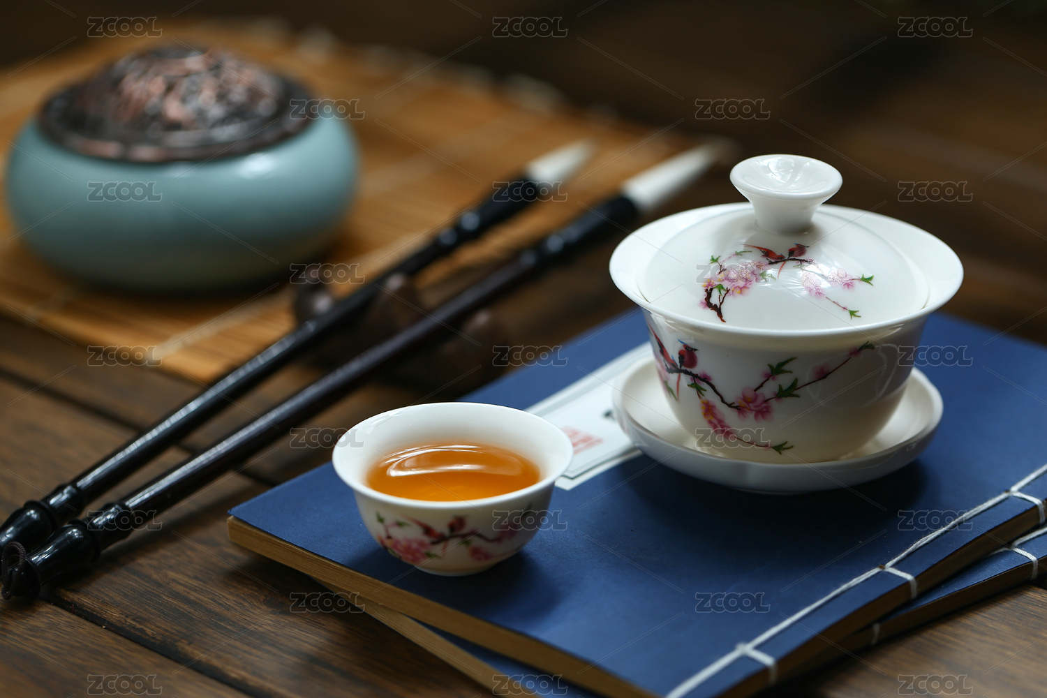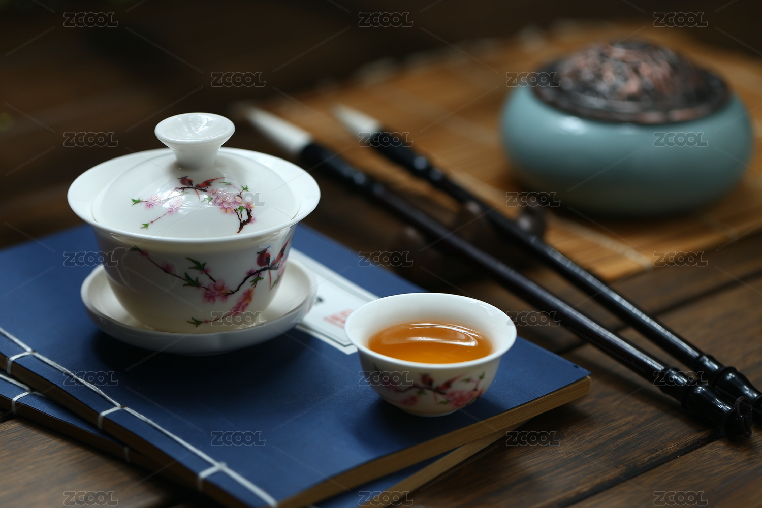 茶杯,盖碗,线装书和毛笔放在书桌上