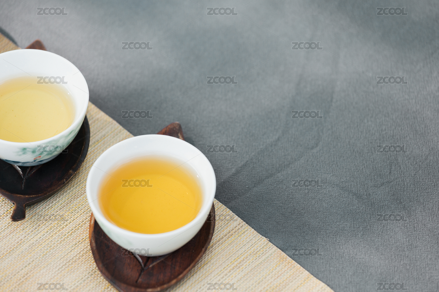 两个白色瓷器茶杯和绿色秘色瓷器复古茶壶冲泡茶叶场景。