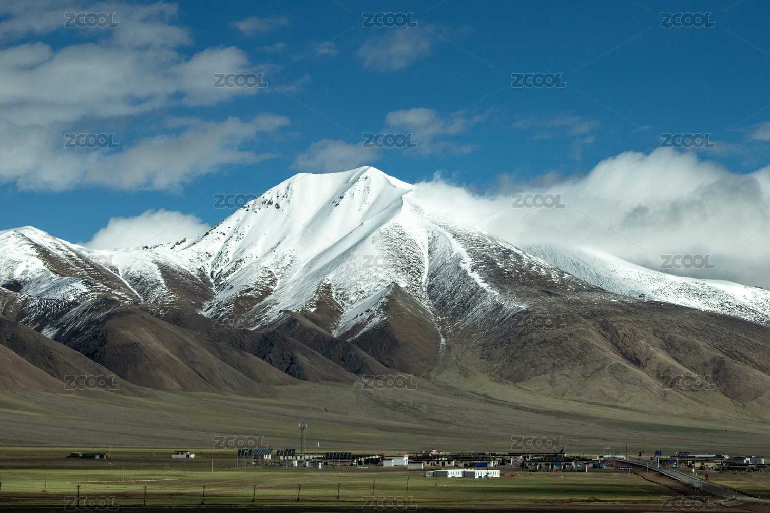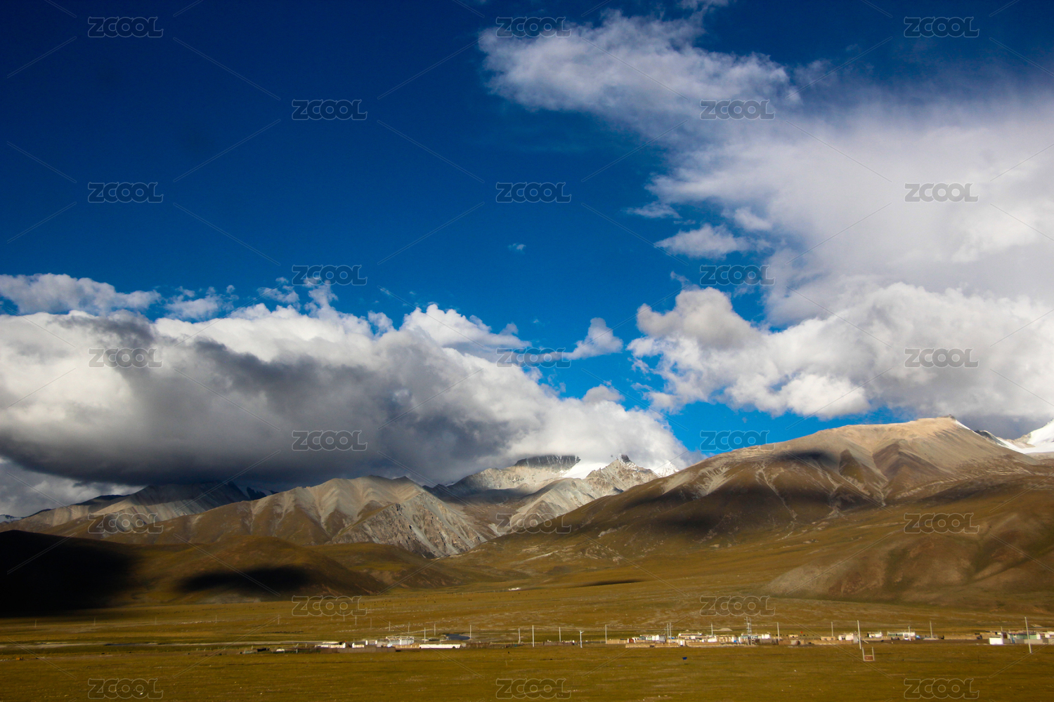 中国西藏藏族自治区318国道五月的远眺群山白云与荒野村庄