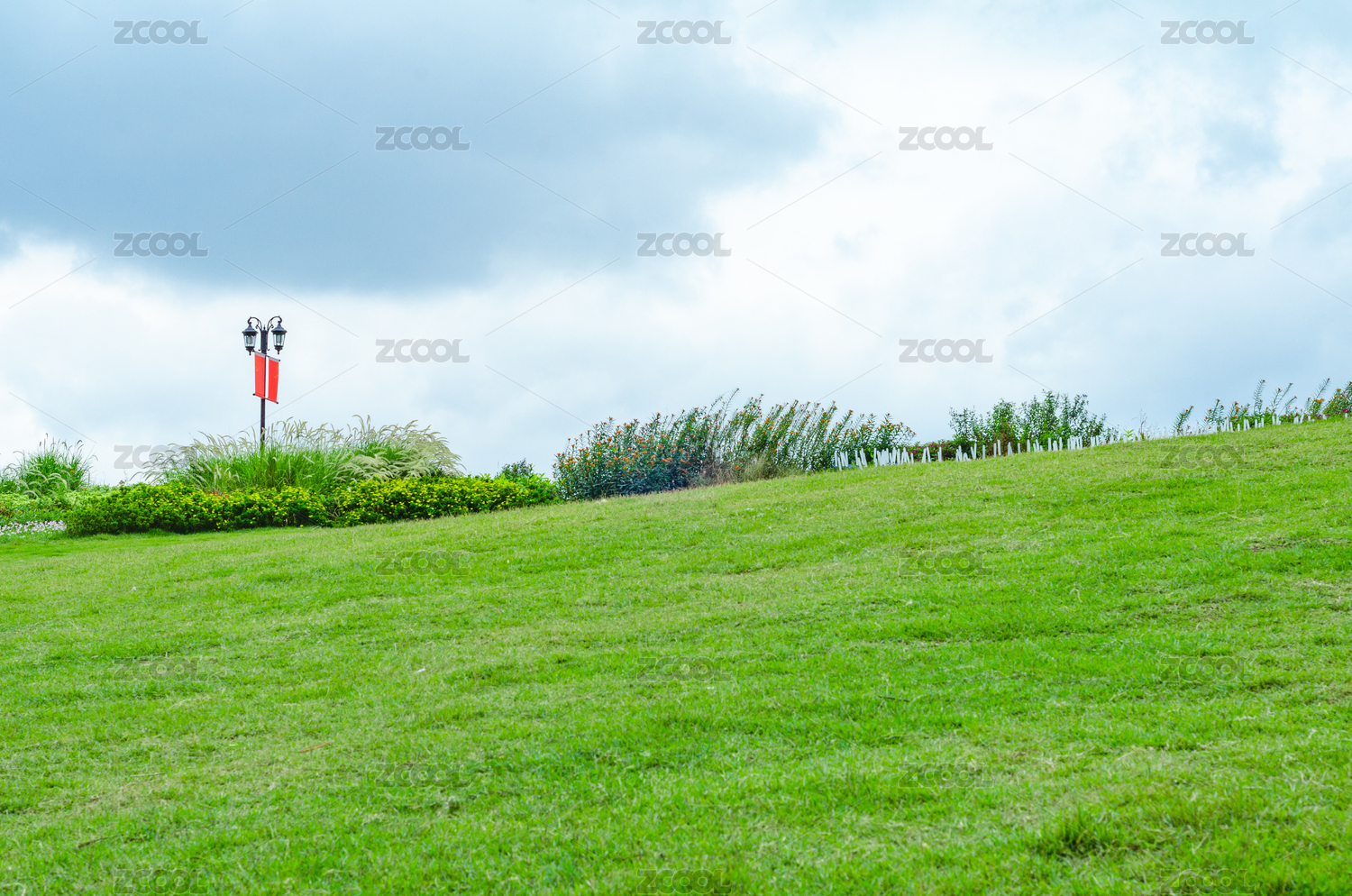美丽的自然风光,蓝天白云绿草地路灯