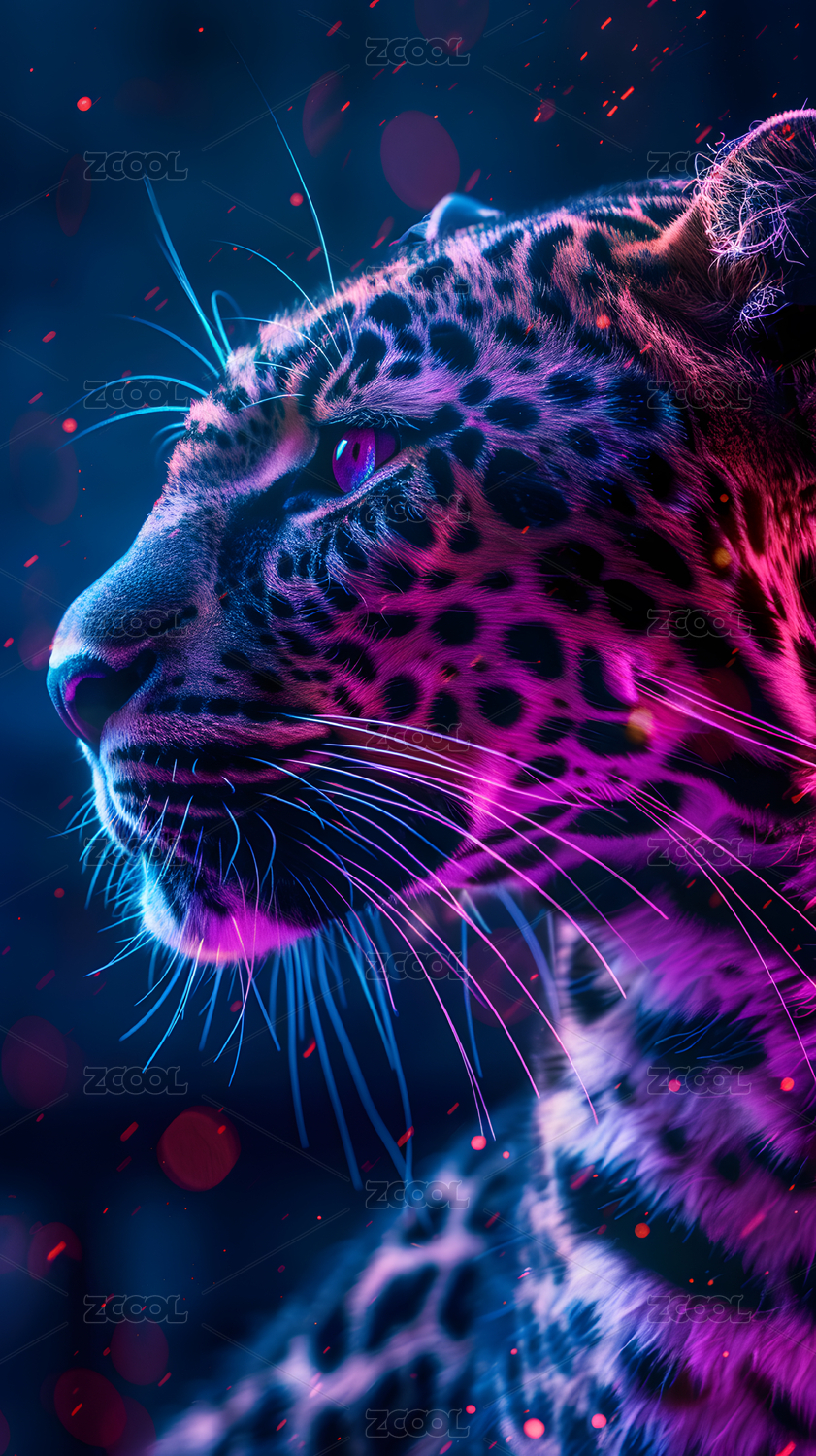 黑底黑背景荧光色豹子发光线条透视X光插画