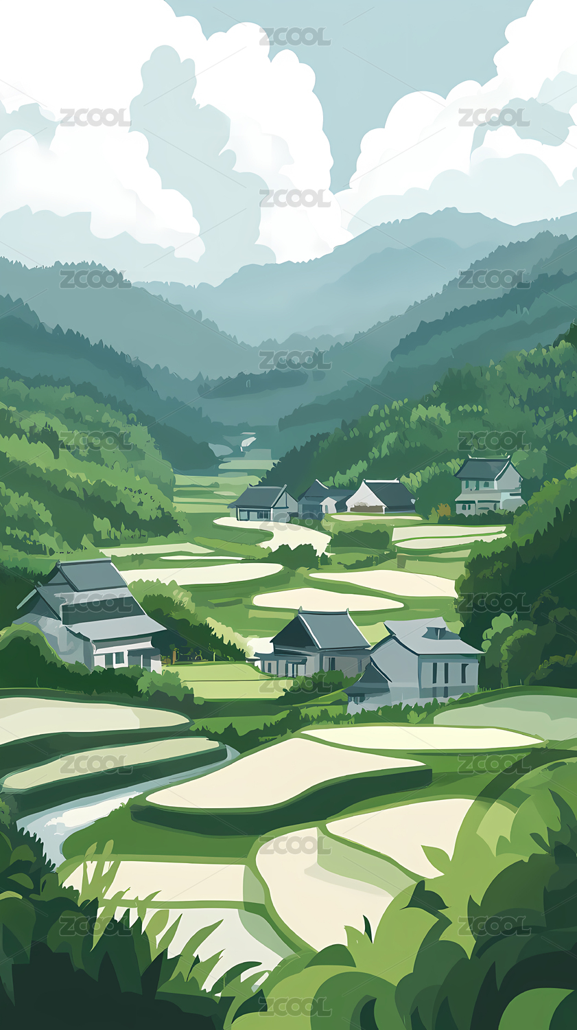 绿色农田乡间小路树木花草房屋山坡立夏插画