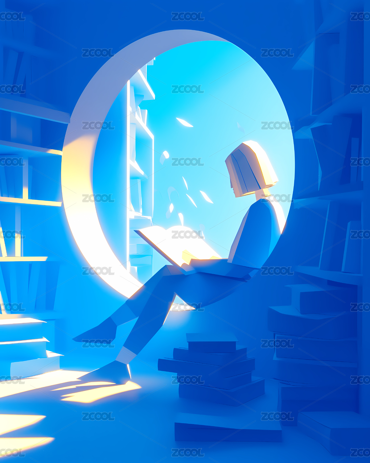 少女坐在窗户前看书读书日3D插画