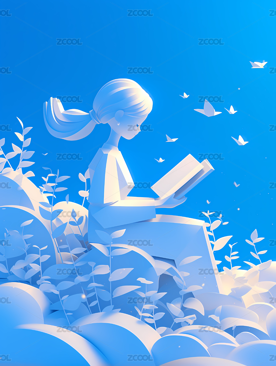 小女孩坐在花草中看书世界读书日3D插画