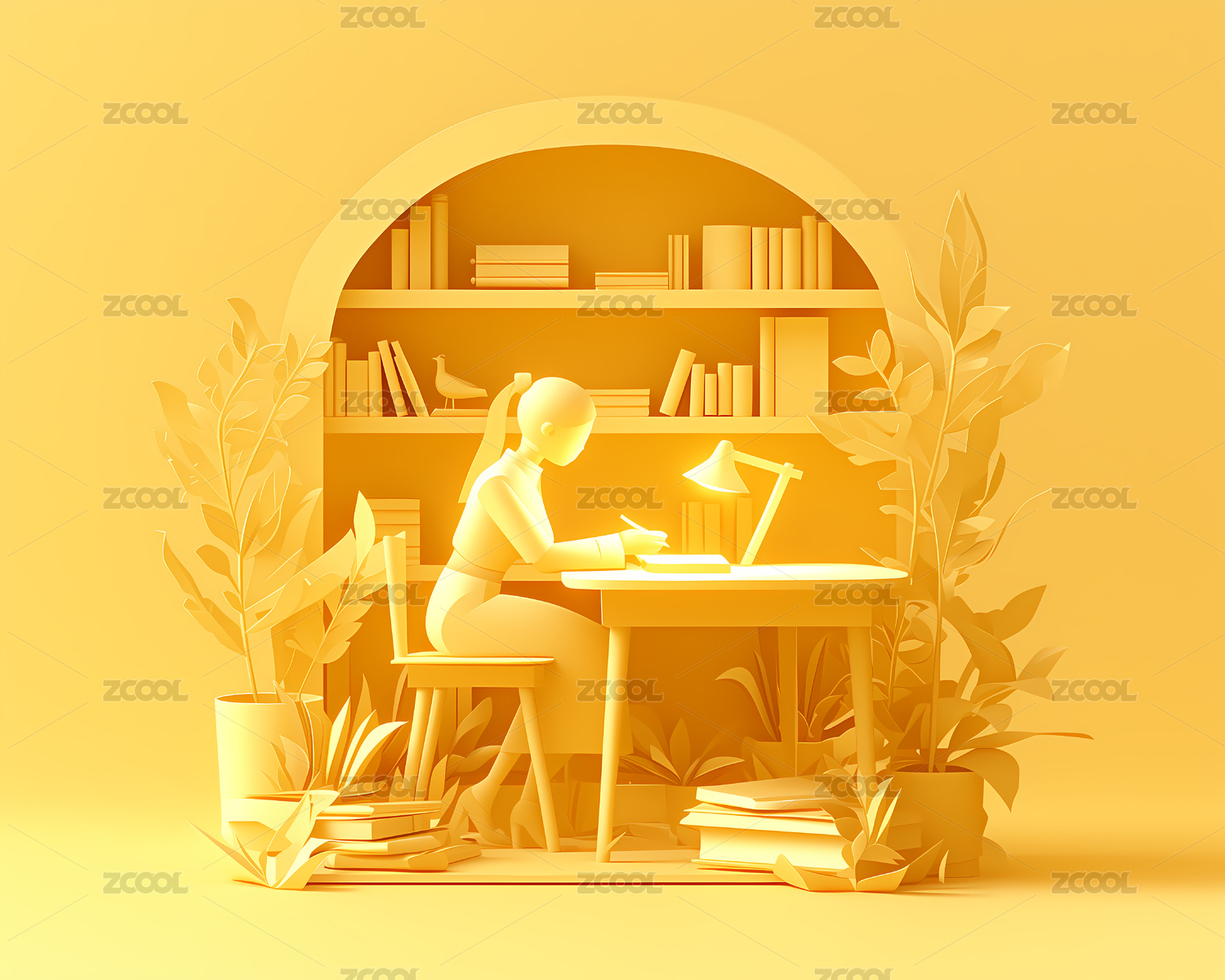 女性坐在书桌前工作学习台灯书架盆栽插画