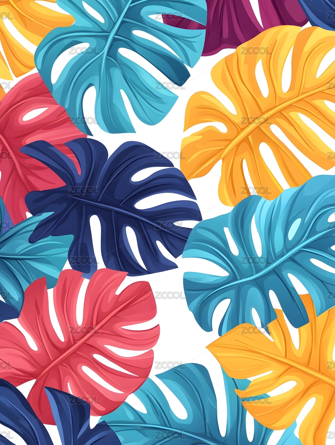 夏天彩色植物叶子四方连续循环无缝拼贴图案