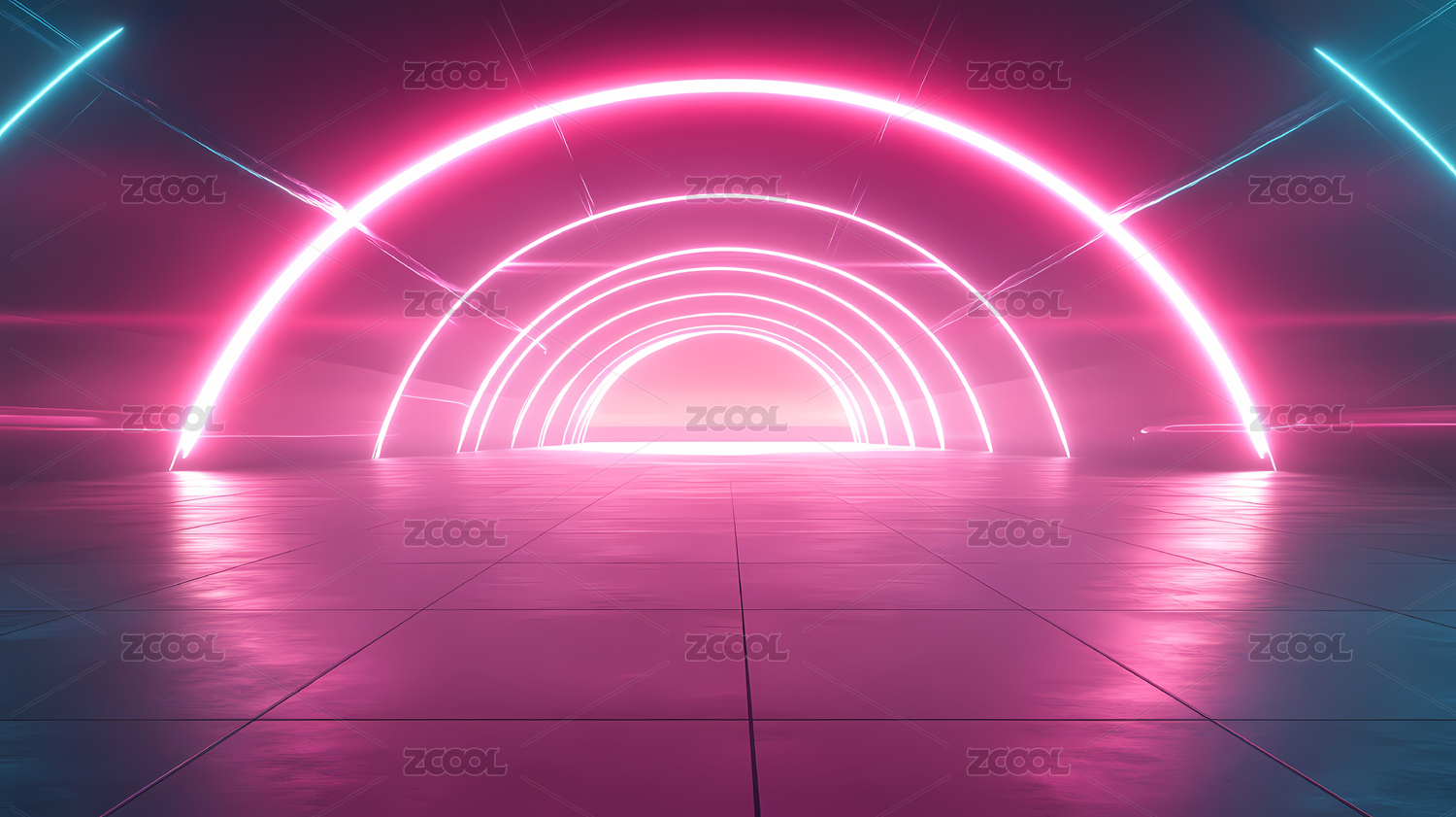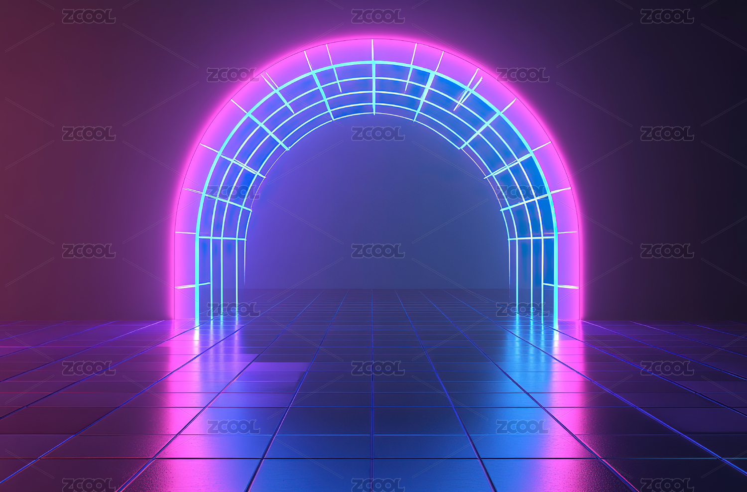 抽象背景,发光的蓝色霓虹光弧和网格地板