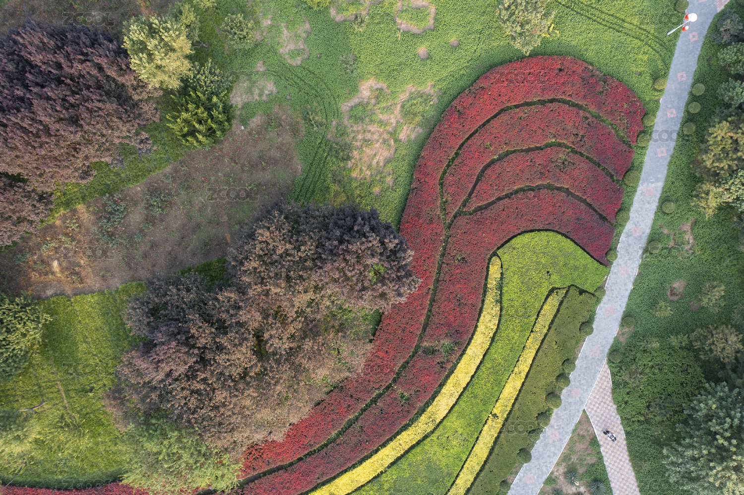 航拍郑州月季花海下沉式花园巨型花朵形状