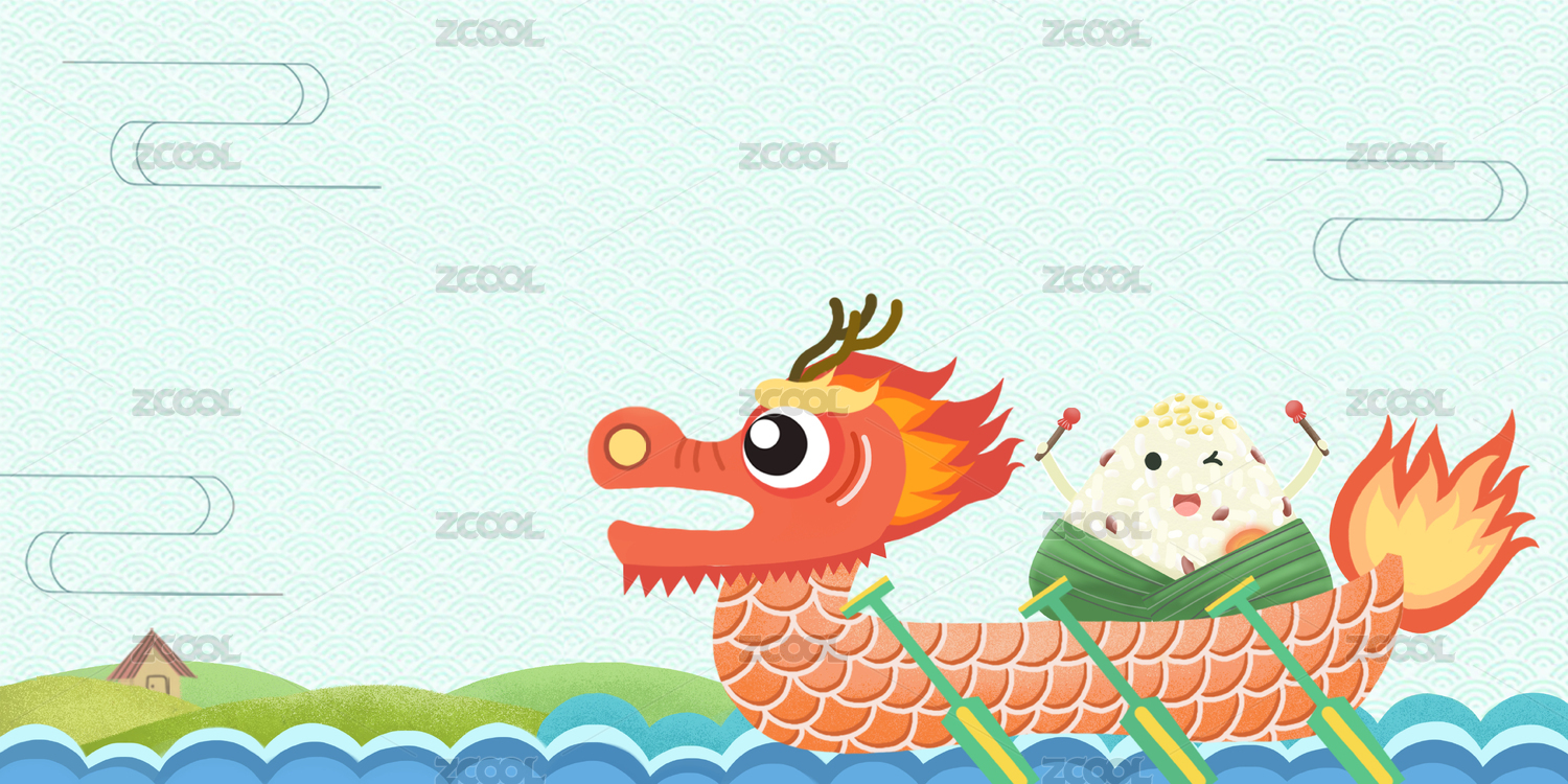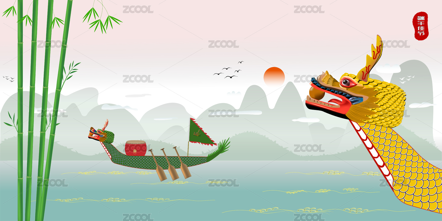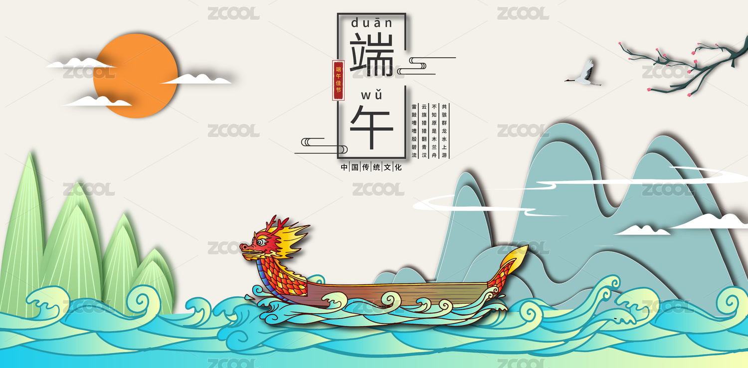 国潮传统端午节粽子击鼓龙舟远山和海浪