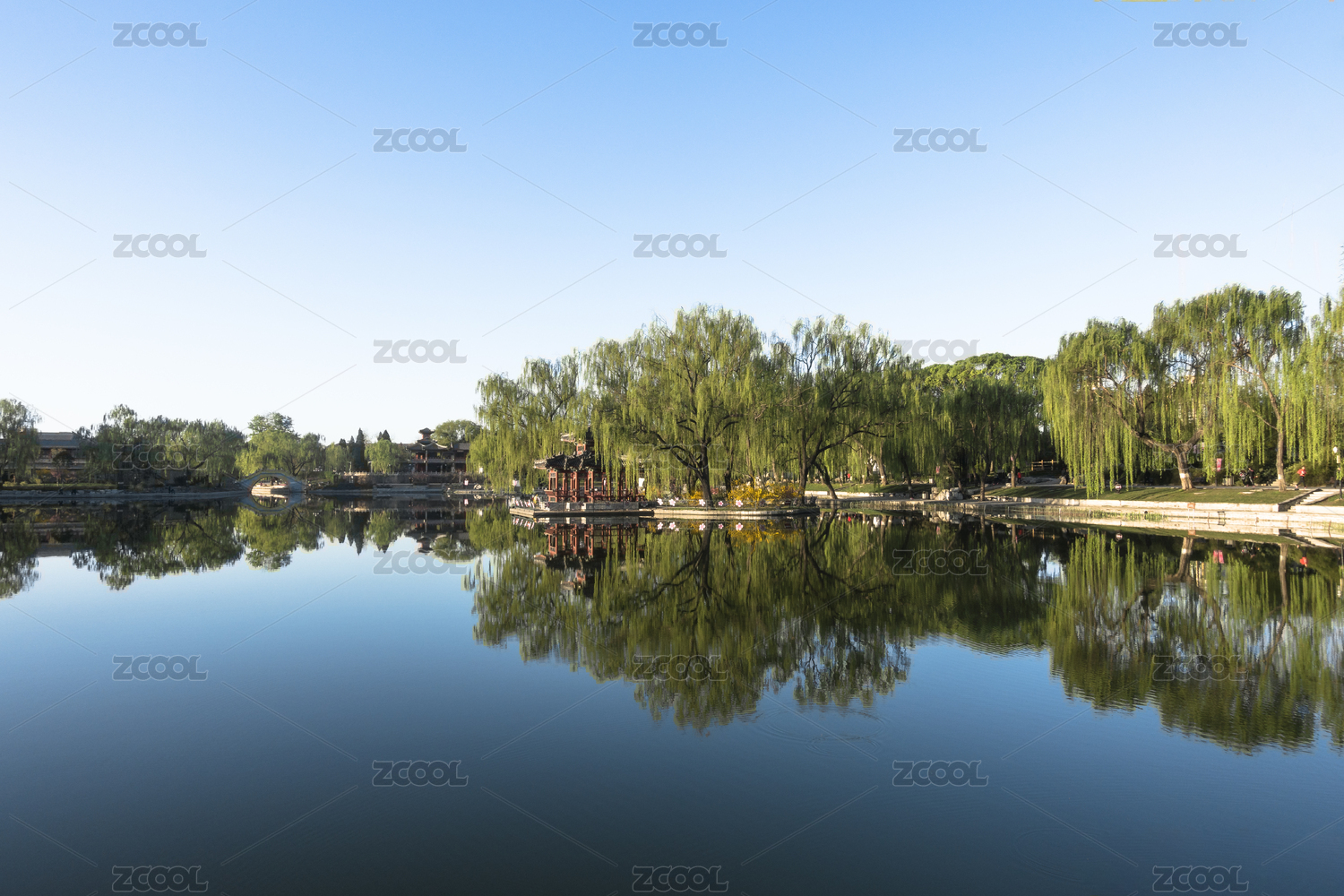 金黄色垂柳环绕的北京陶然亭公园湖心亭