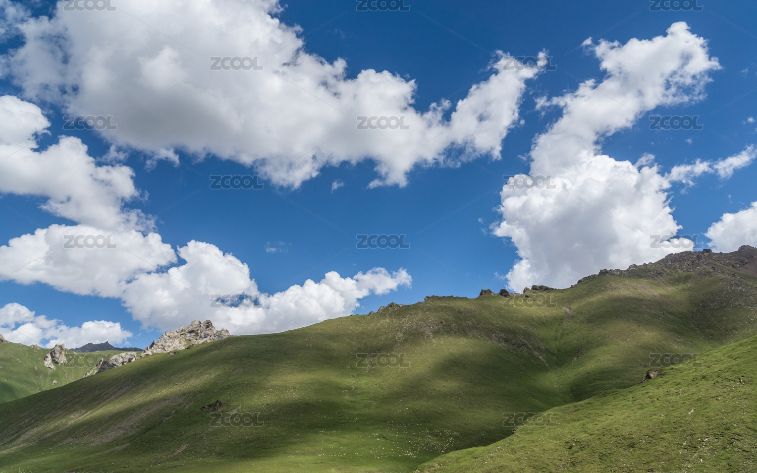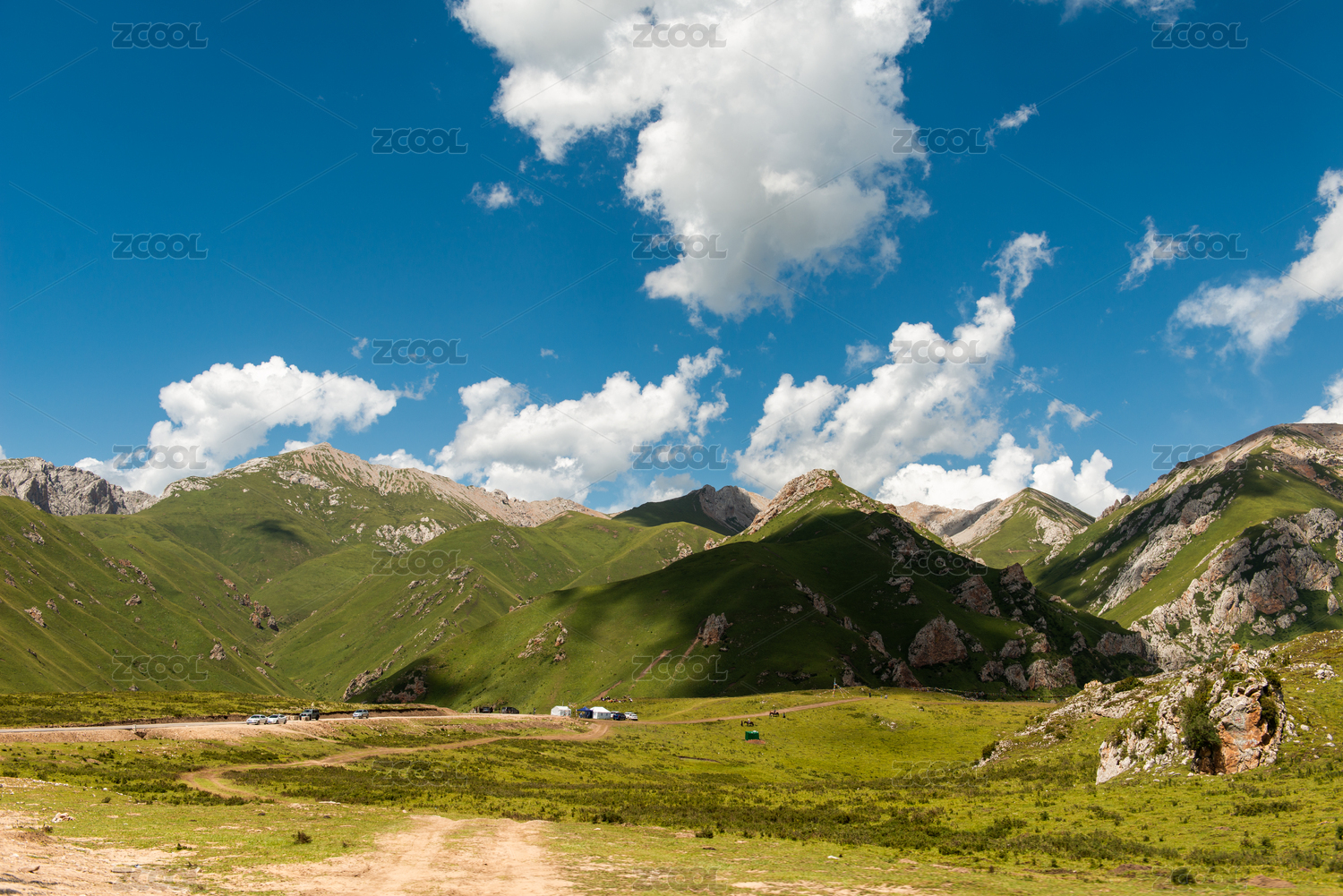 中国新疆夏季蓝天白云下G217独库公路沿途高山草原