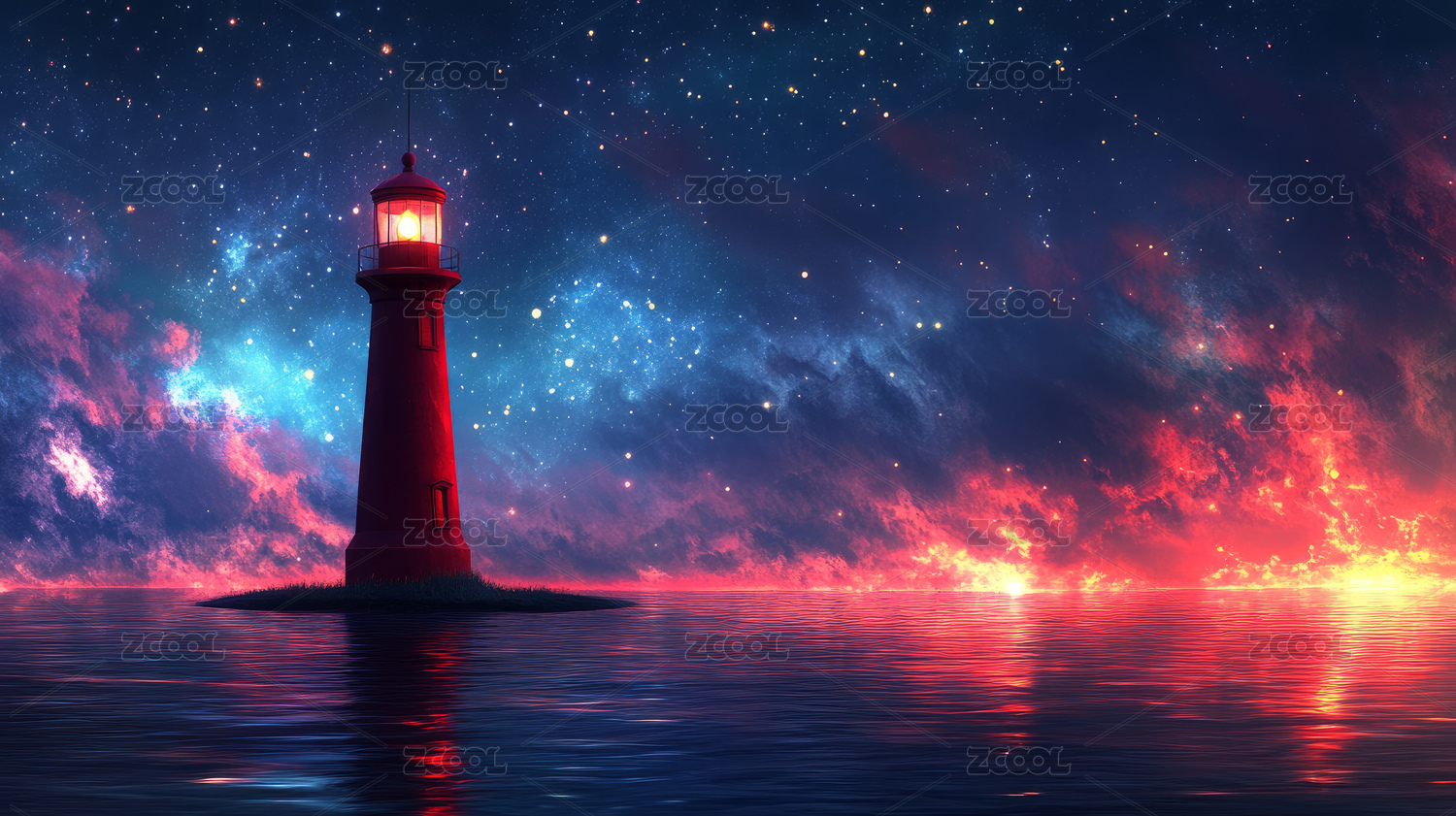 灯塔,大海,插画,平静,风景,岛屿,云朵,梦幻,超现实,星空