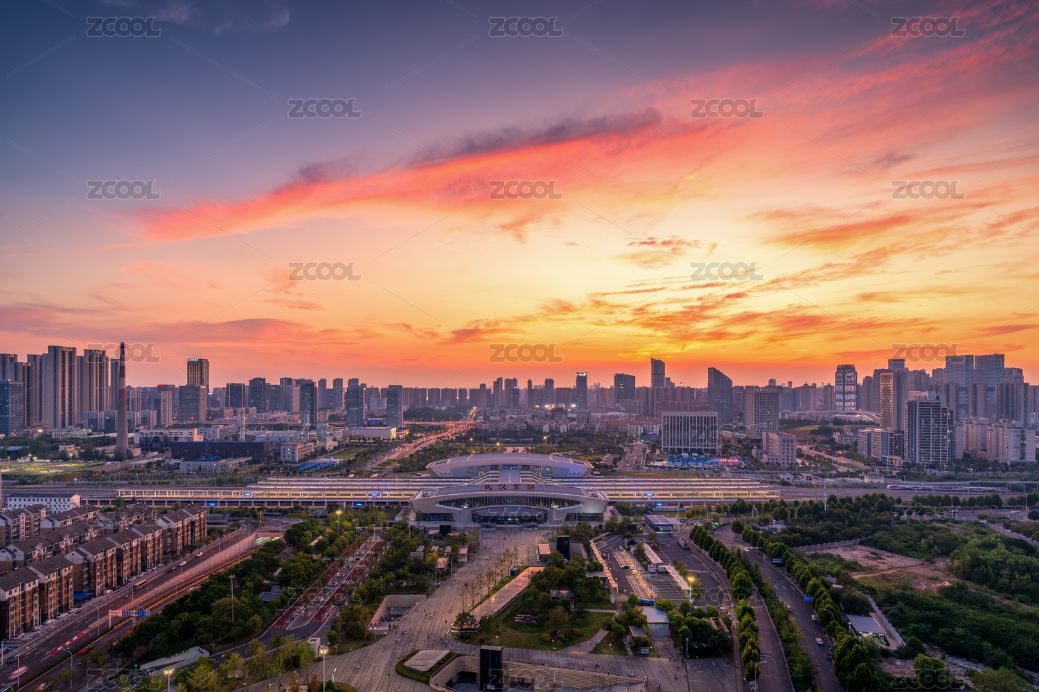 俯瞰晚霞时分的成都金融城双子塔及周边建筑