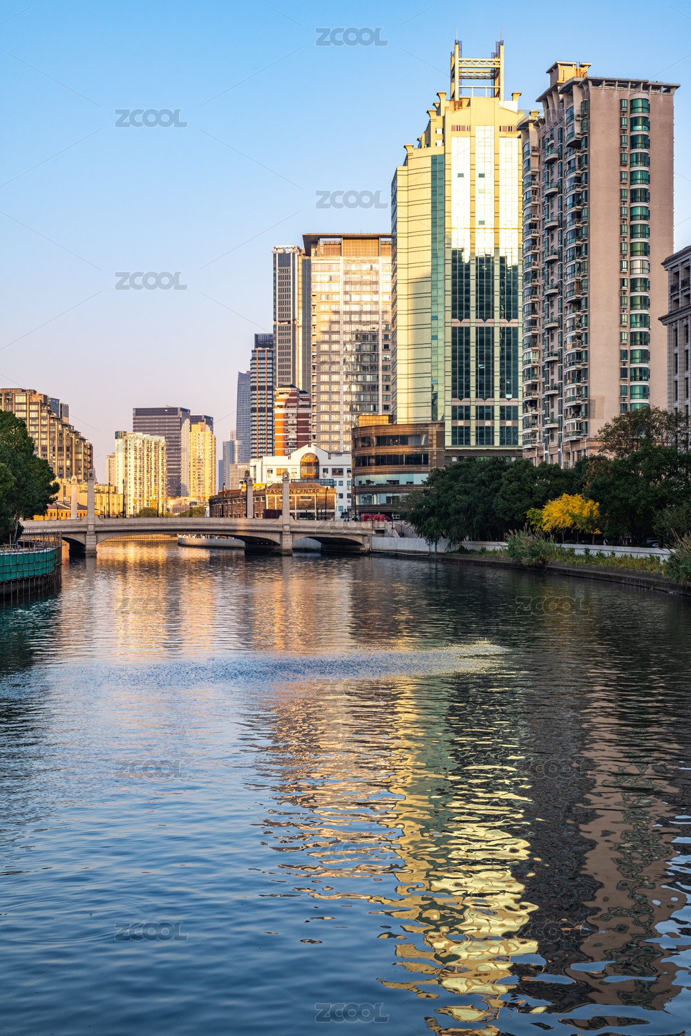 中国天津海河的水路交通和现代建筑及桥梁天际线