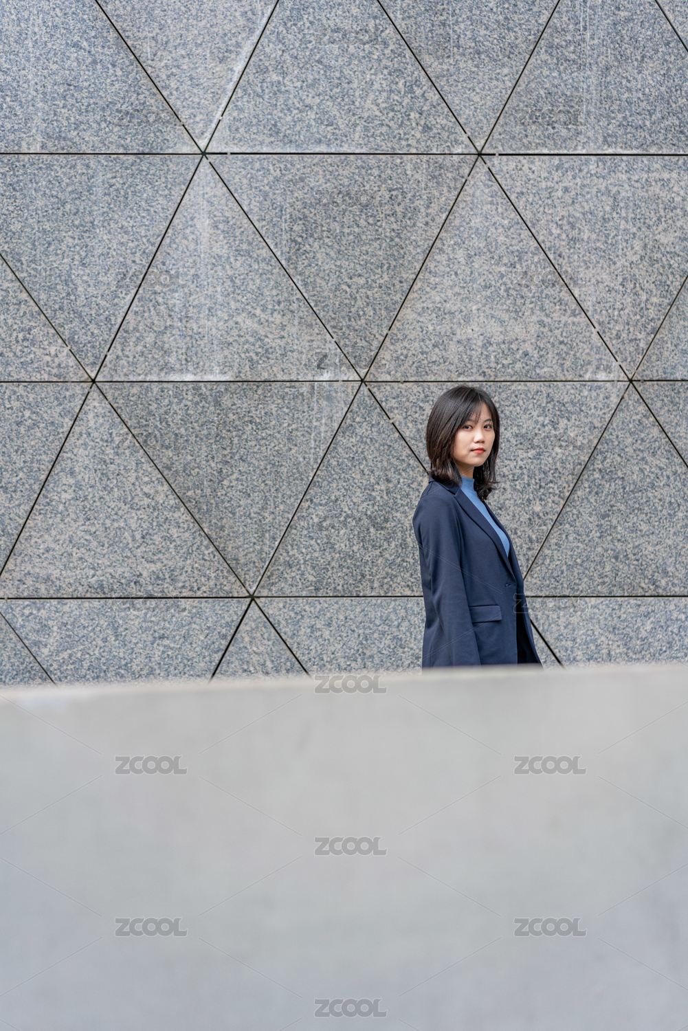 灰色墙壁前面年轻的商务女性面向镜头微笑