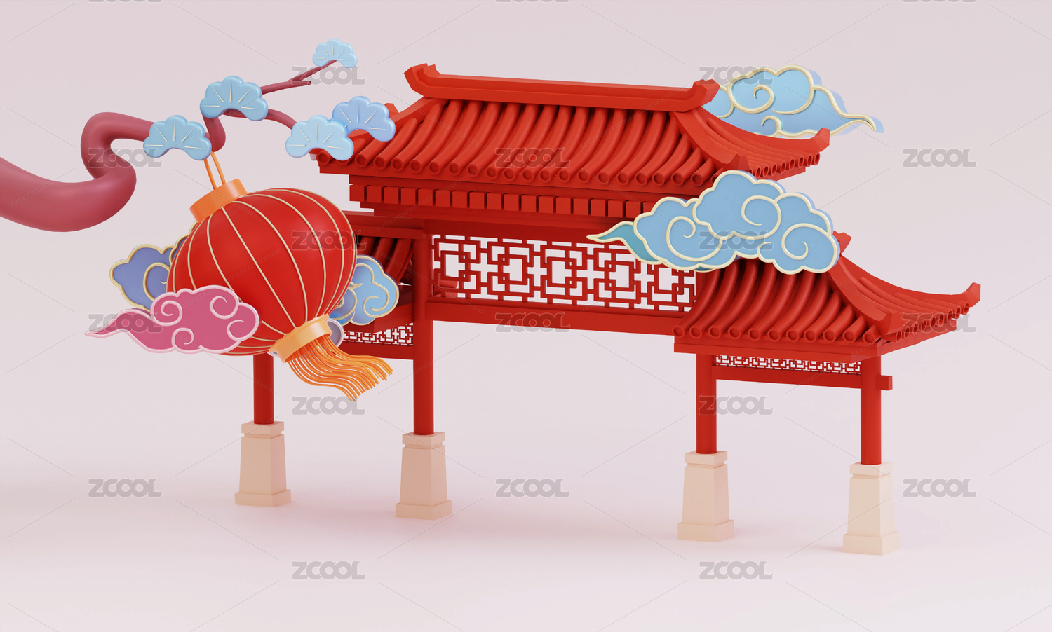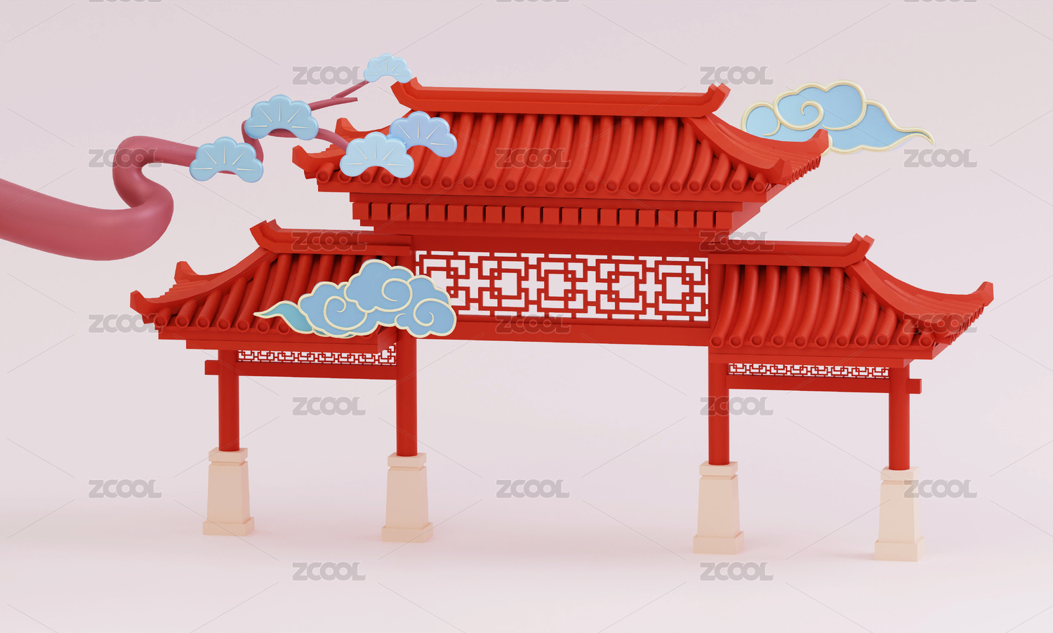 3D中国风松树牌坊城楼门子