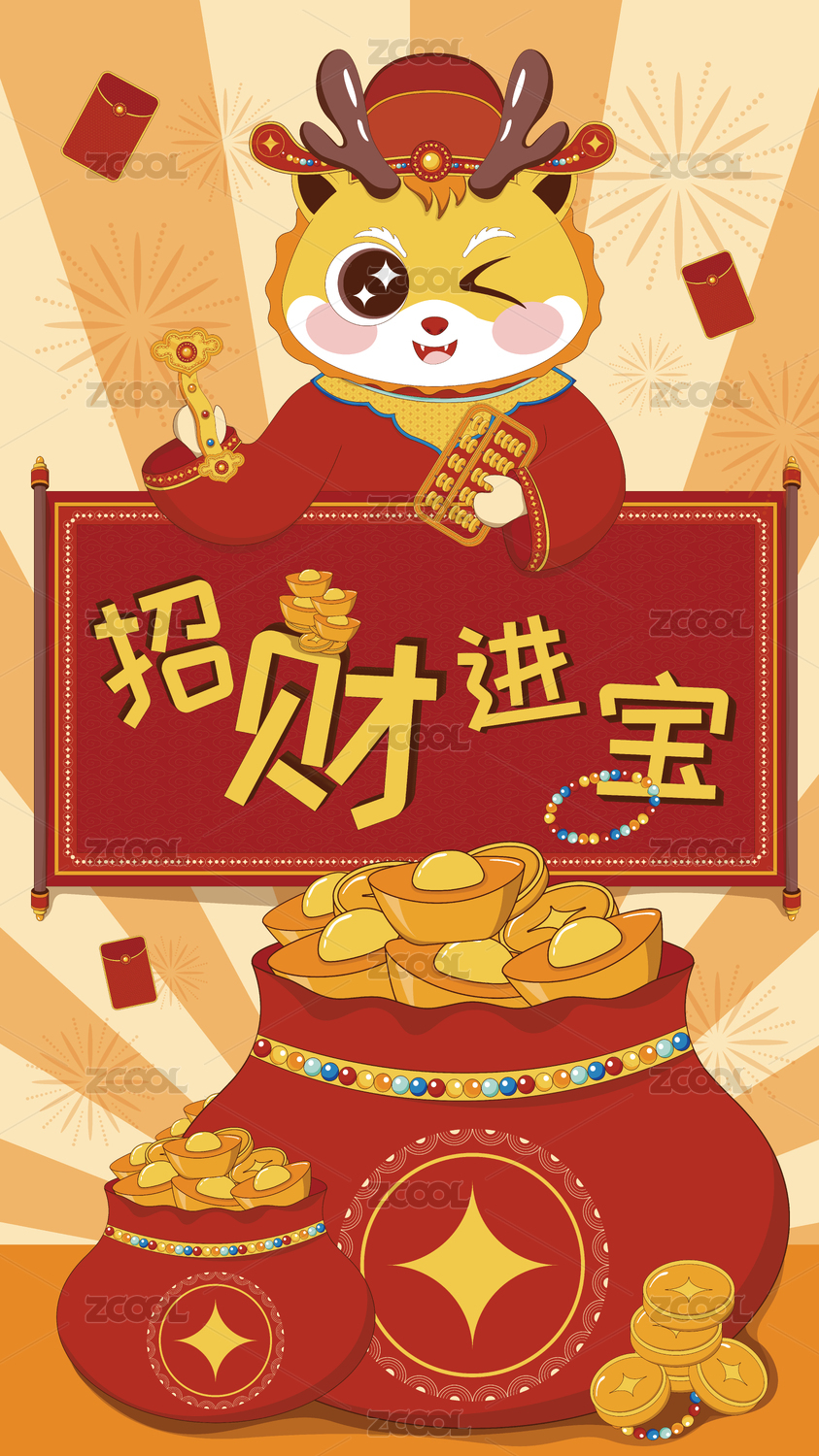 可爱龙年IP新春财神喜庆竖版壁纸插画