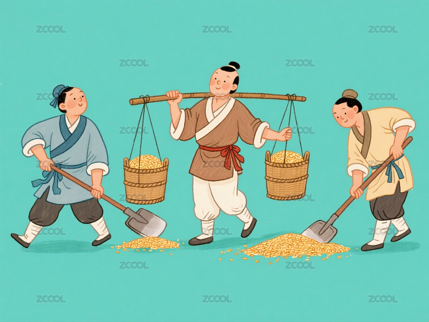 农夫挑担运粮两人铲粮