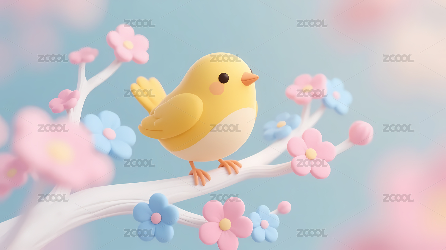 黄色小鸟粉蓝花朵景