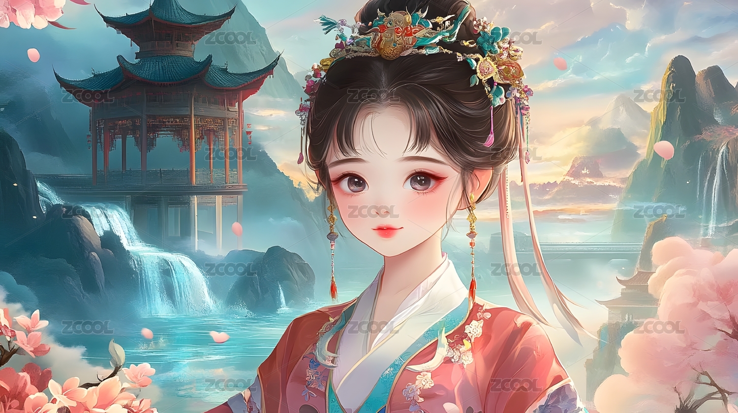 国潮,汉服,背景,人物,女孩,底图,插画,壁纸,五彩,缤纷