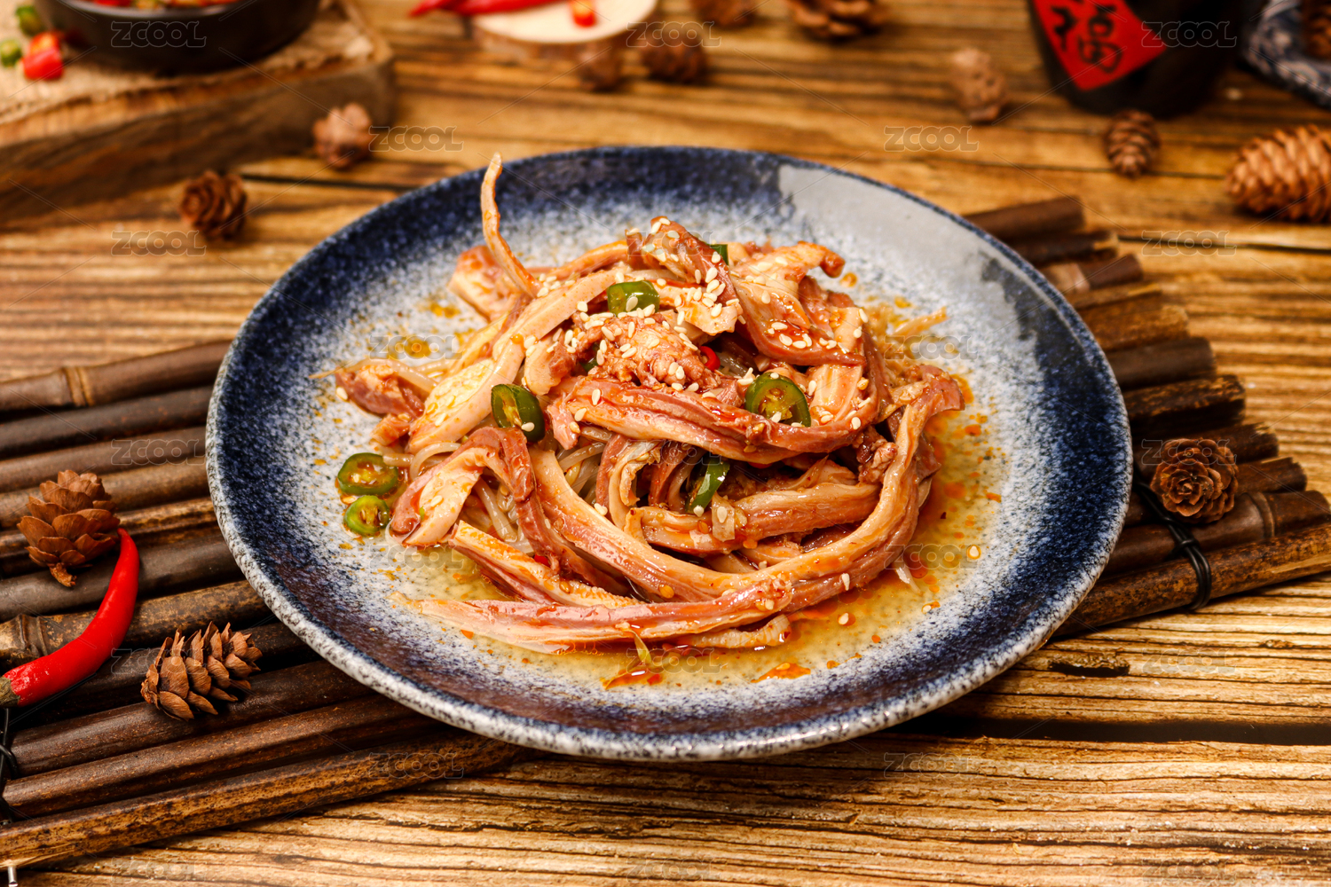 猪耳朵,切丝,暗色调,木纹板桌面,红辣椒,砧板,香葱