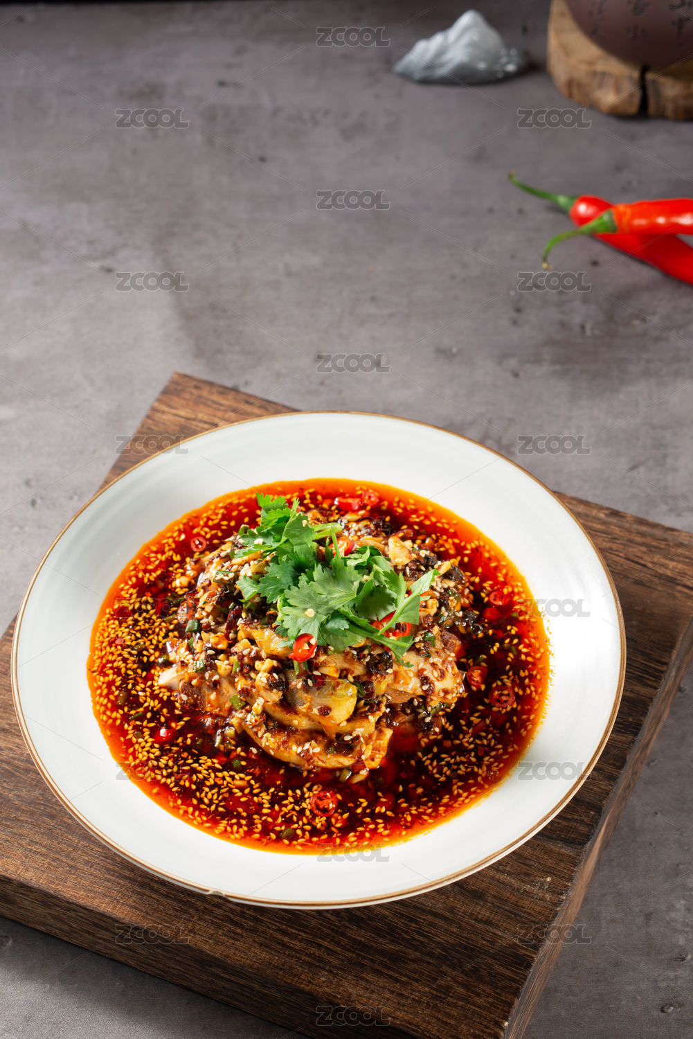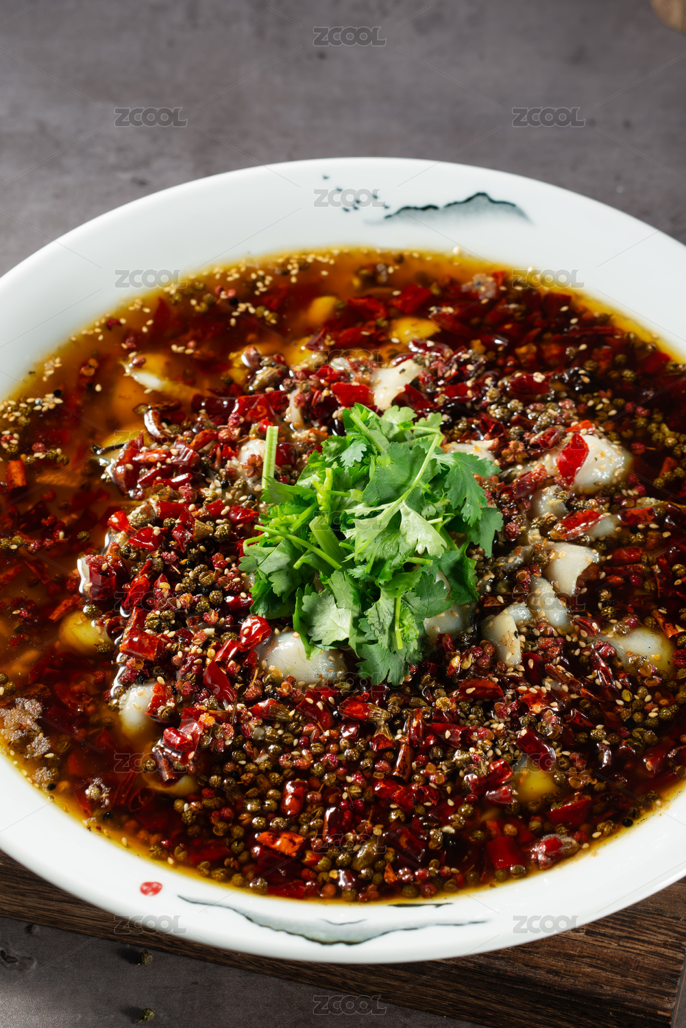 青瓷盆装的川味香辣水煮龙利鱼