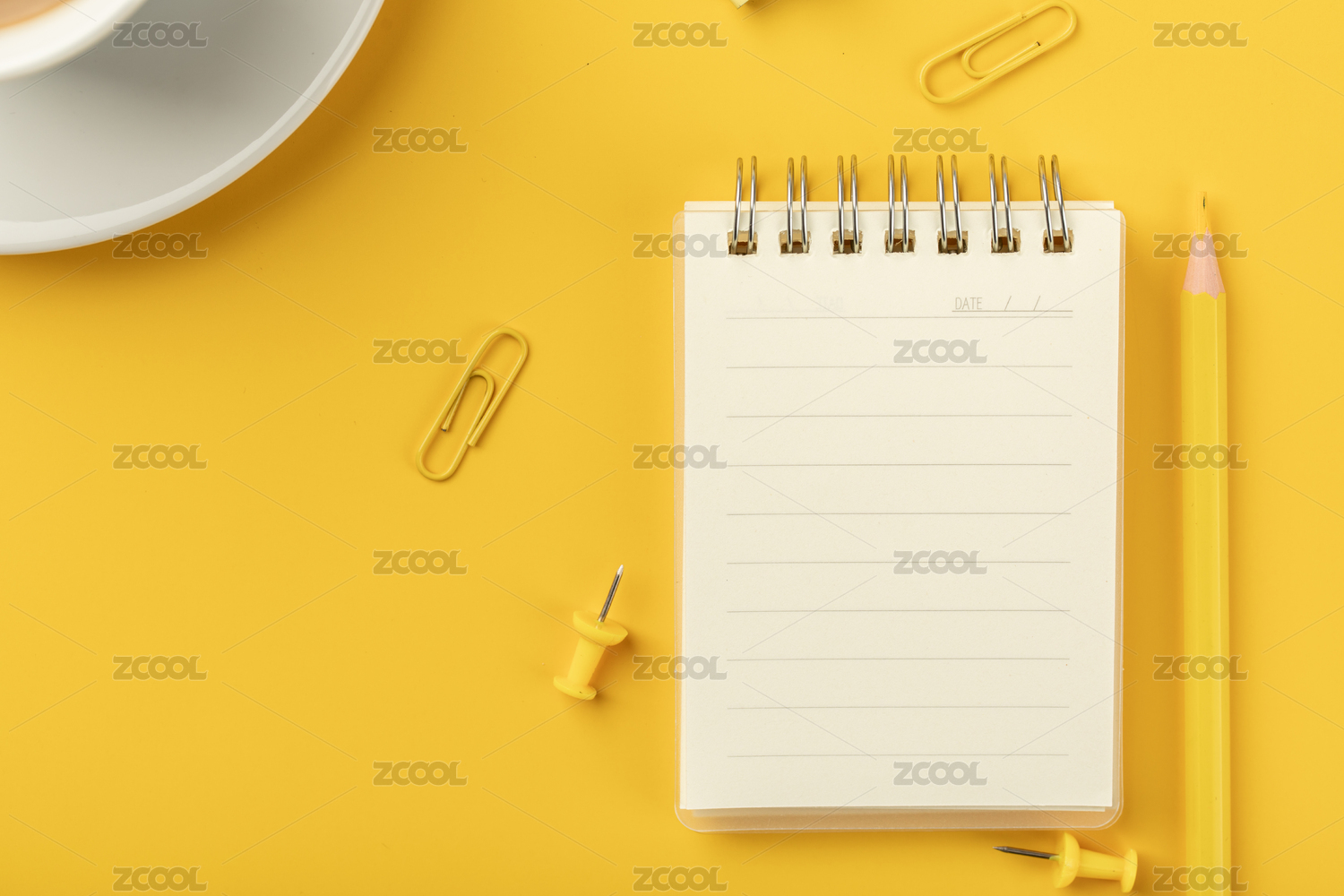 正上方蓝色背景下的螺旋笔记本和铅笔照片