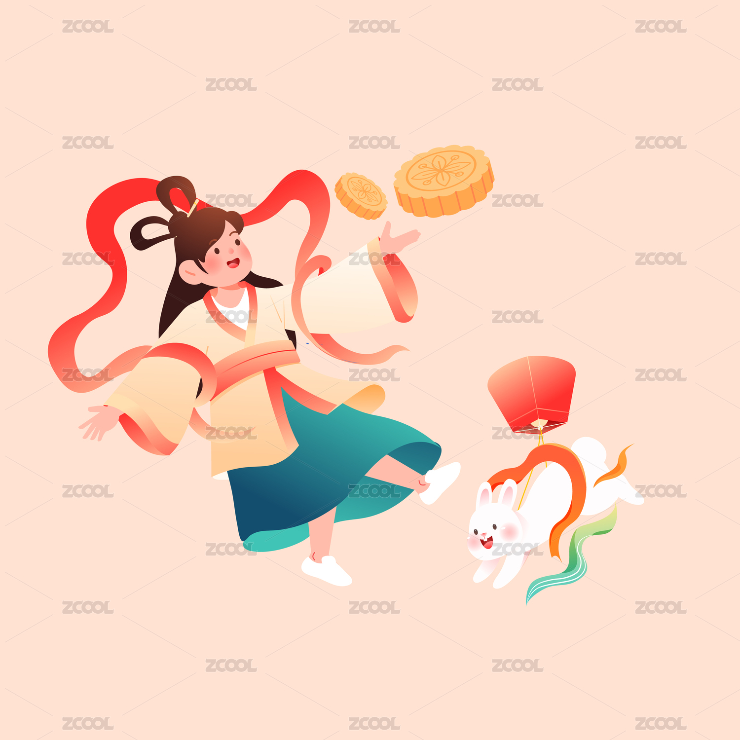 中秋,祥云,国潮,新中式,中国风,卡通,插画,矢量,玉兔,汉服