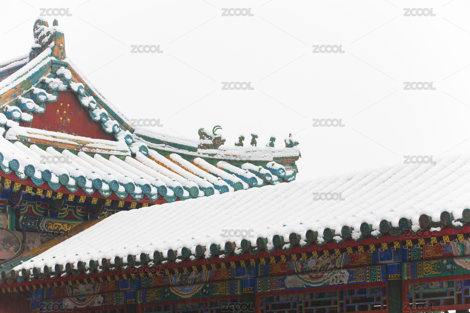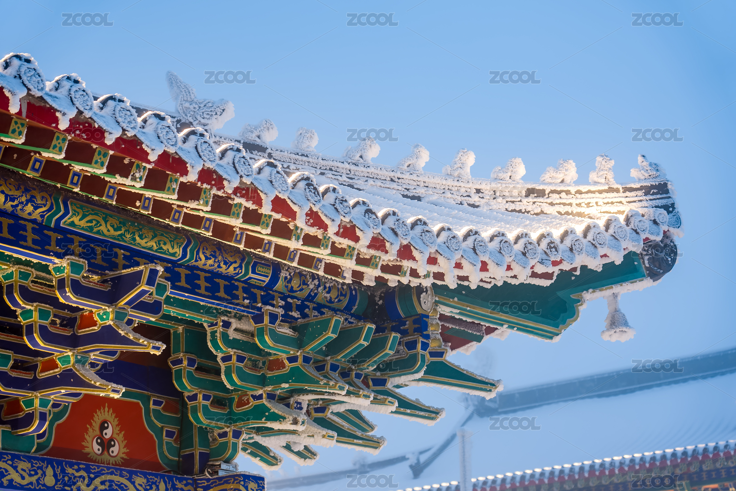 冬天寒冷大雪建筑历史屋檐彩绘旅游背景老君