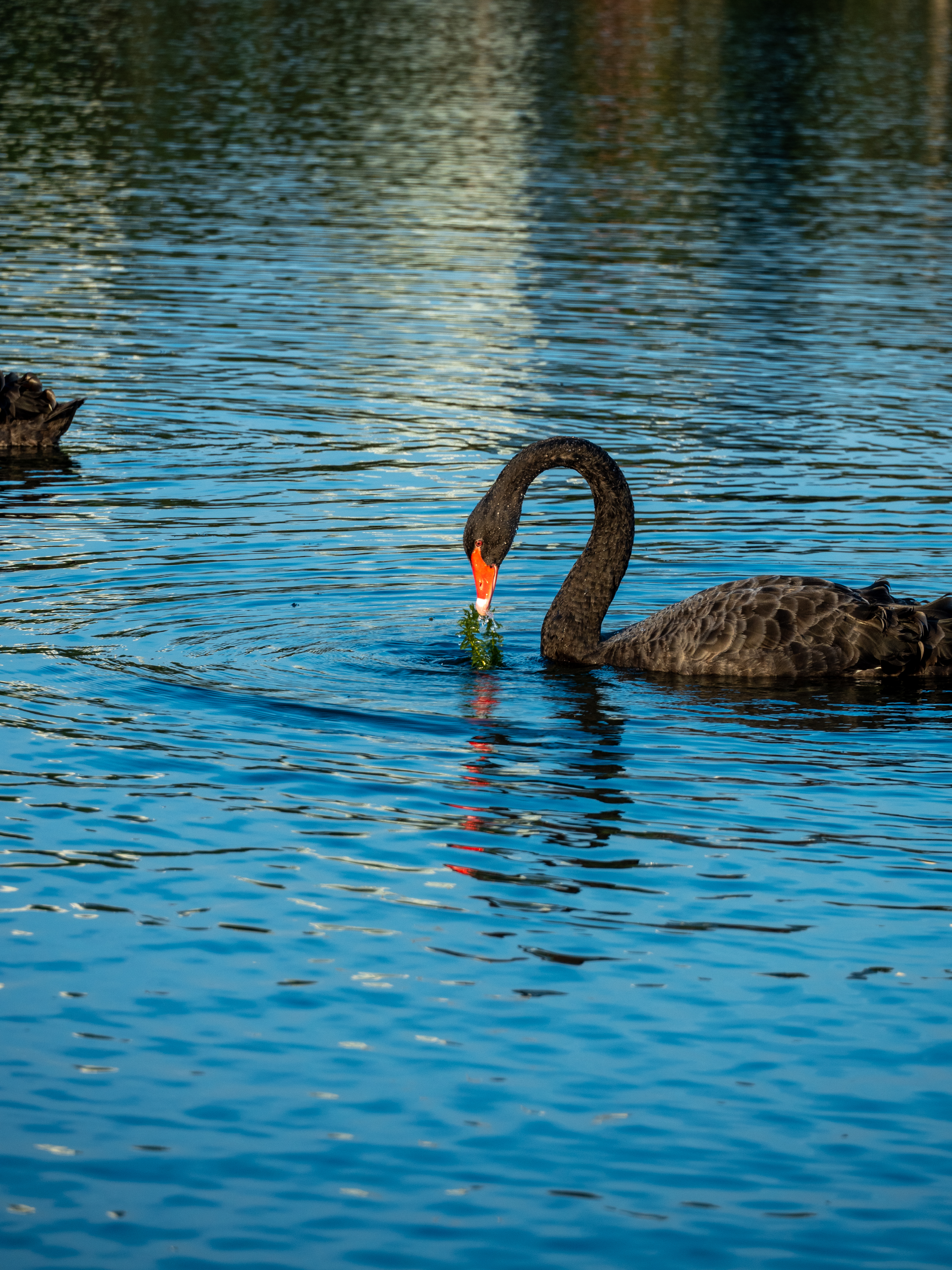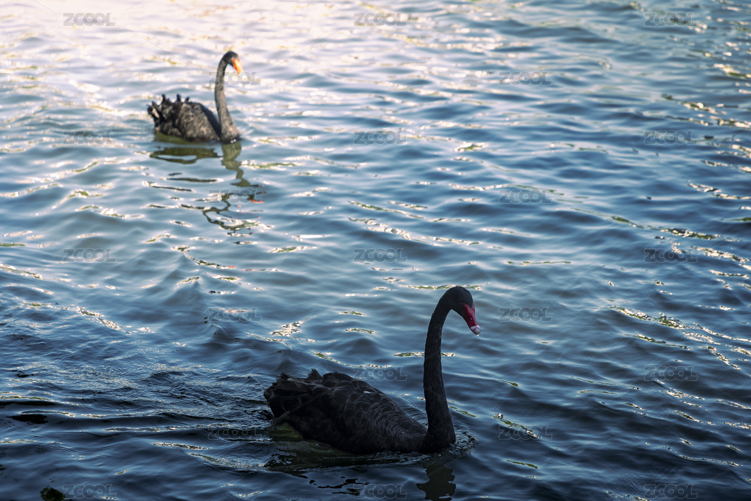 波光粼粼的湖面上游泳觅食的黑天鹅