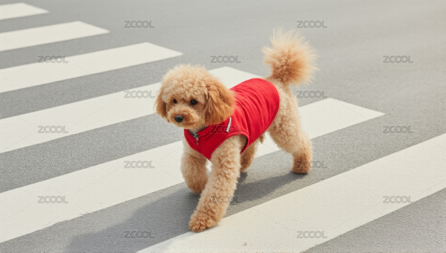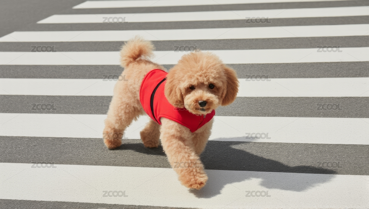 在杂草丛生的公园里,一只穿着衣服的棕色小泰迪犬走在石头铺的路上