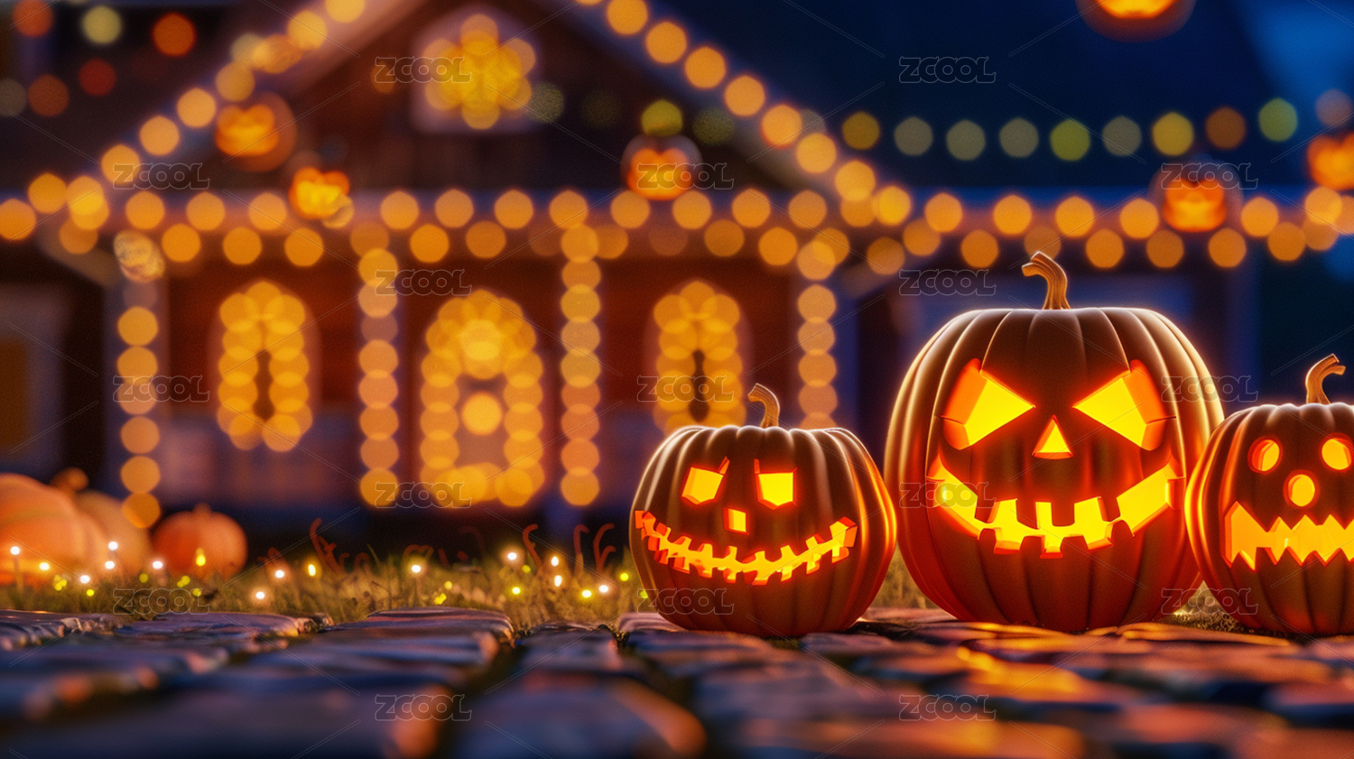 夜幕下的南瓜灯装饰的万圣节庭院背景
