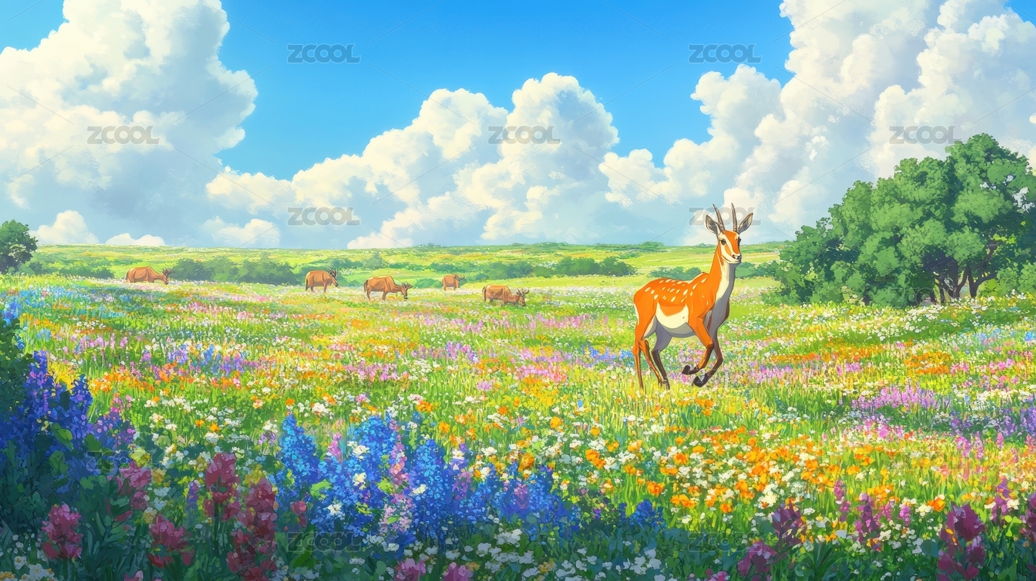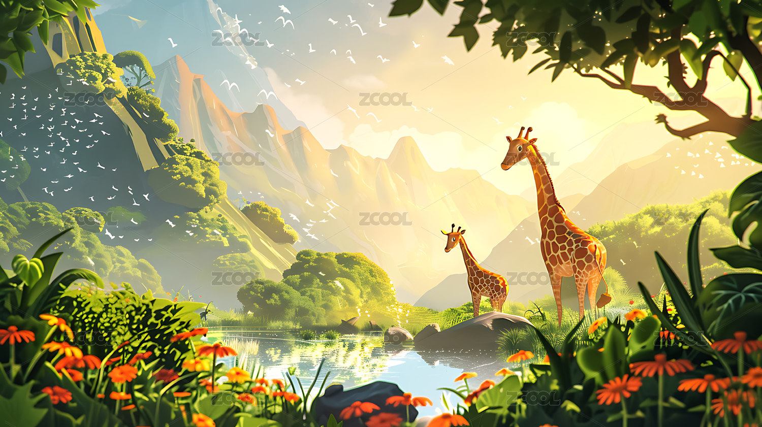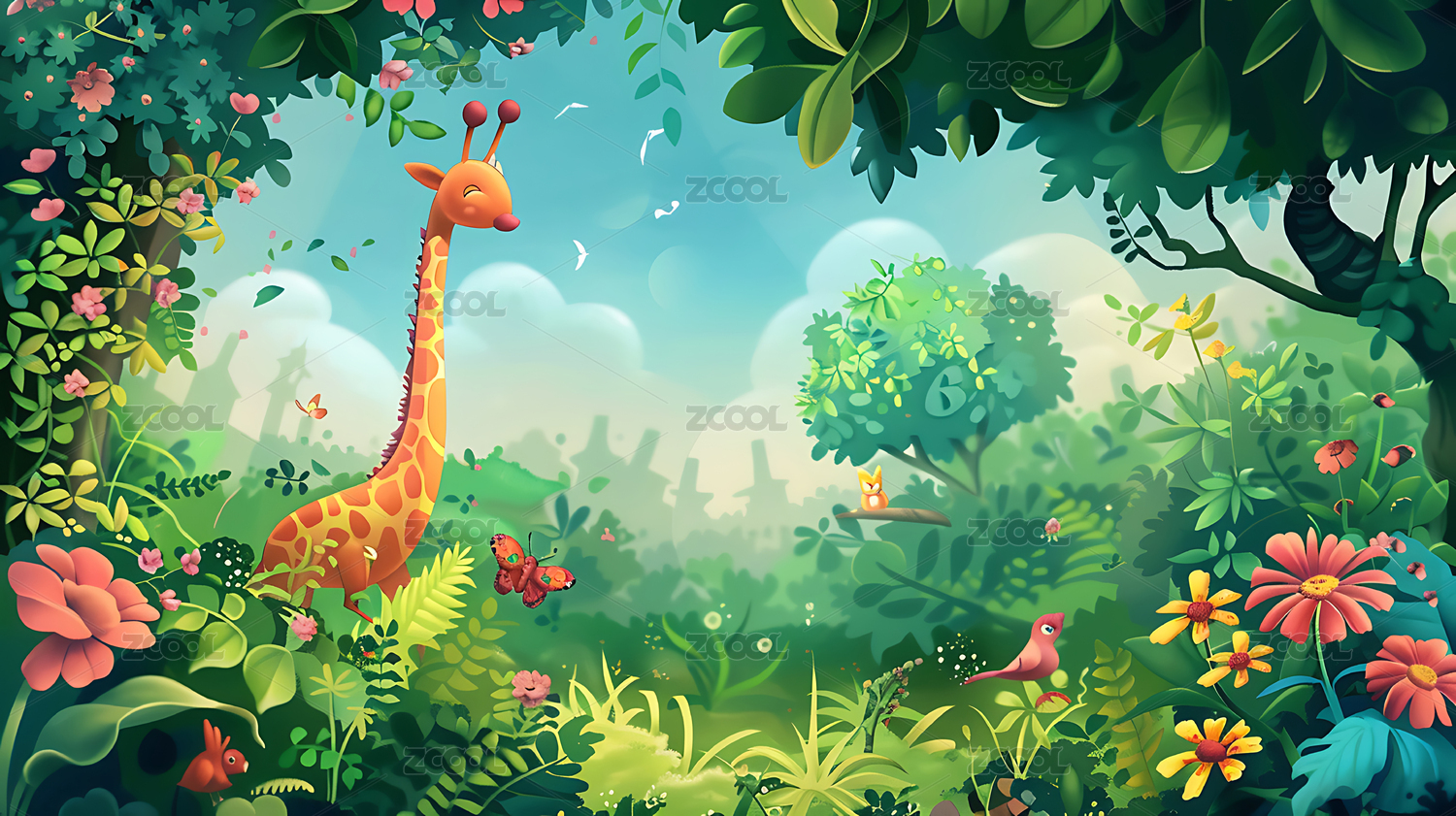 插画,长颈鹿,花,植物,森林,自然,动物,叶子,夏天,清新