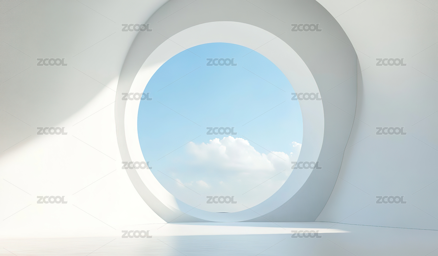 圆形窗洞外的蓝天白云