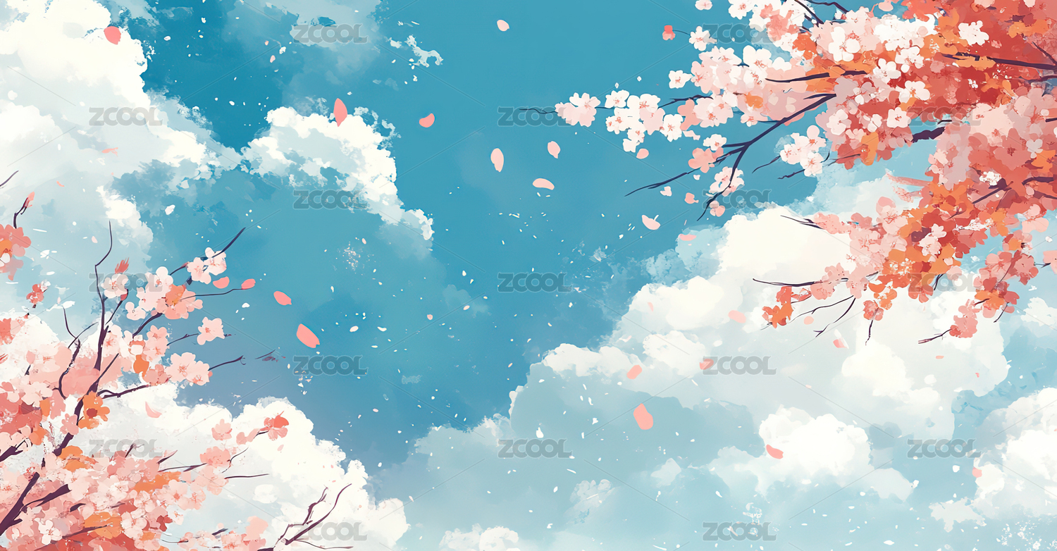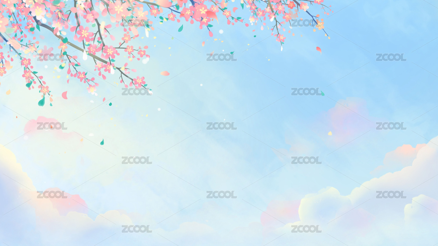 桃花盛开花瓣轻盈飘落在空中-春季唯美插画