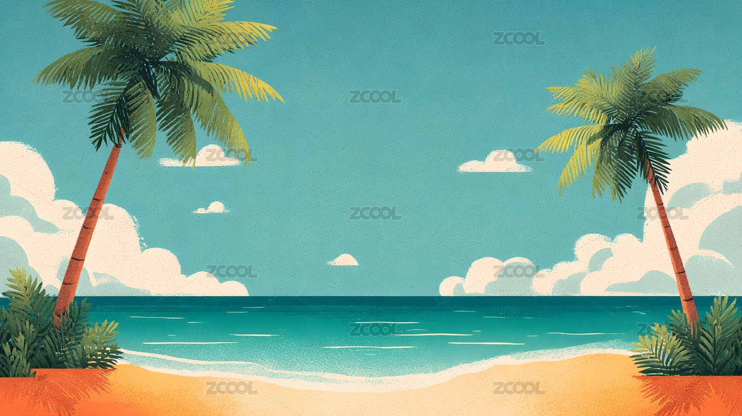 海边沙滩与棕榈叶的夏日图景