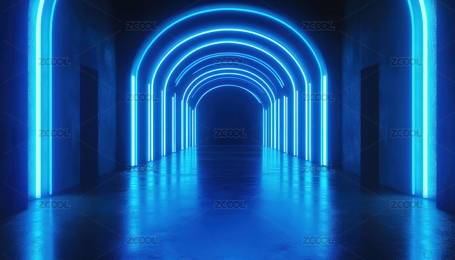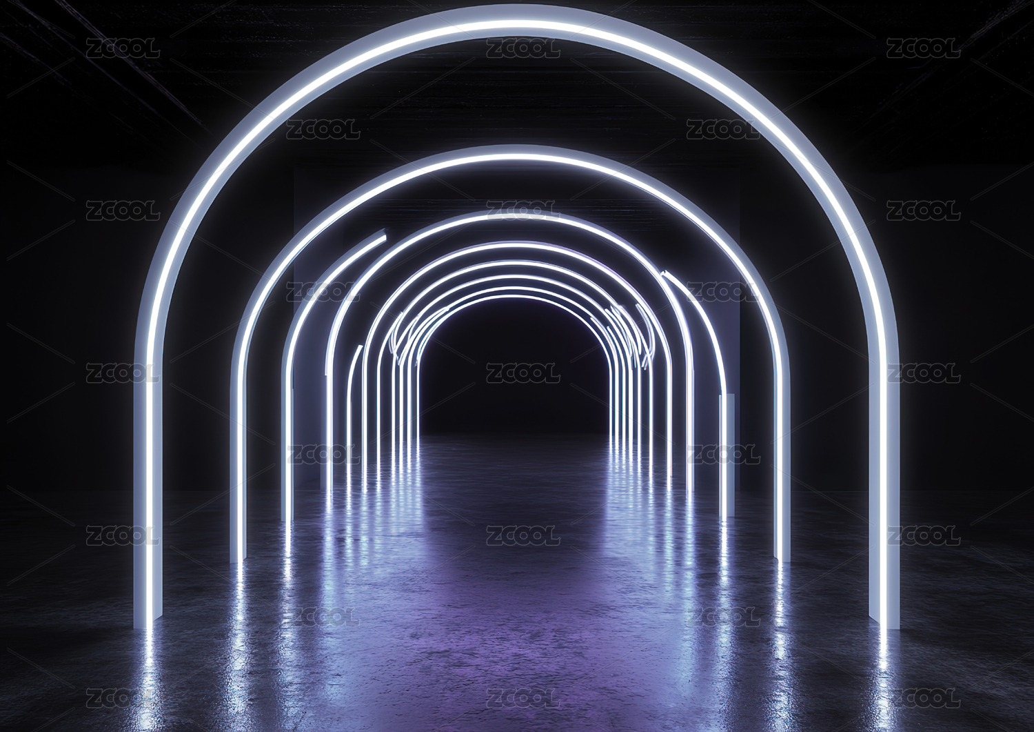 三维渲染蓝紫色霓虹灯拱门室内空间