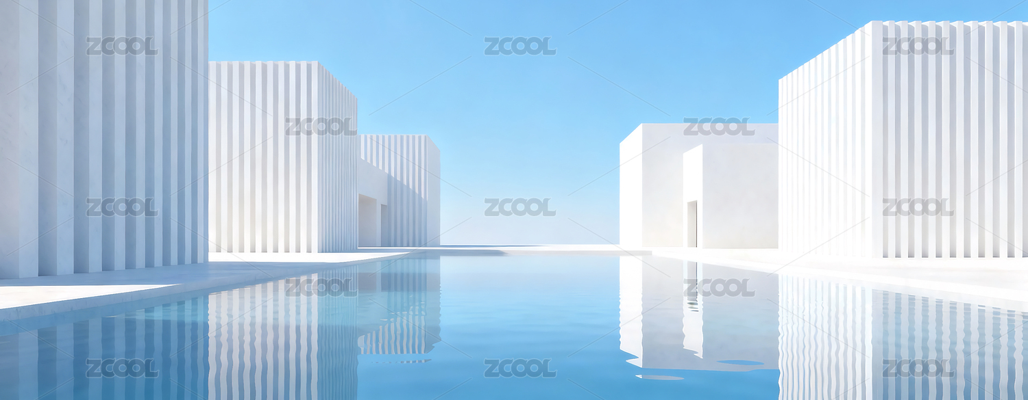 宁静水面的现代极简建筑场景