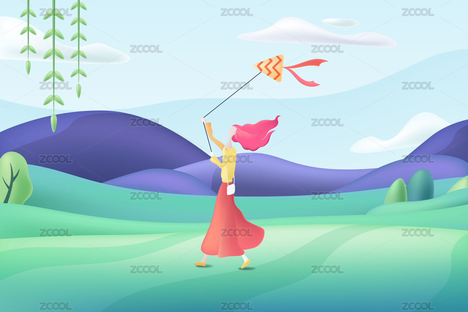 春天,女孩,放风筝,风筝,惬意,春,卡通,插画,手绘,闪屏