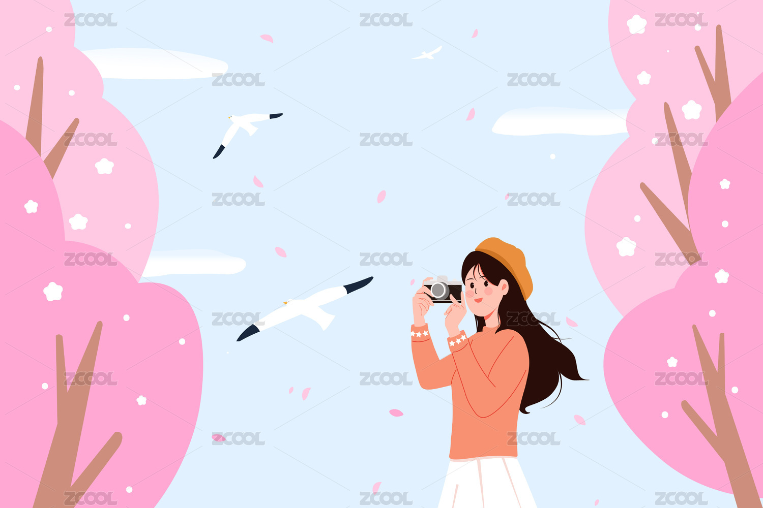 春天在樱花树下拍照赏花的女孩竖版矢量插画