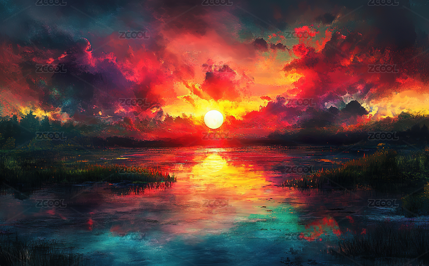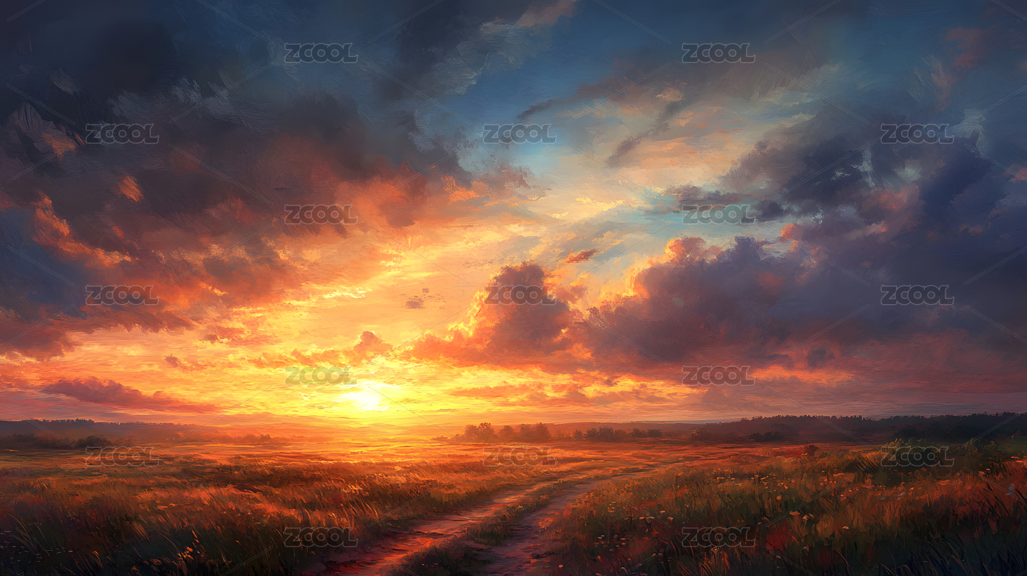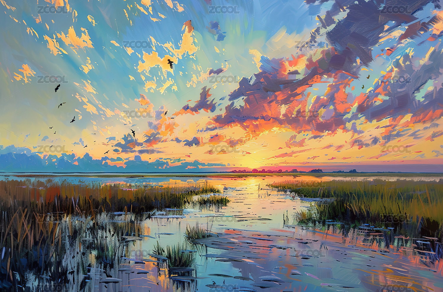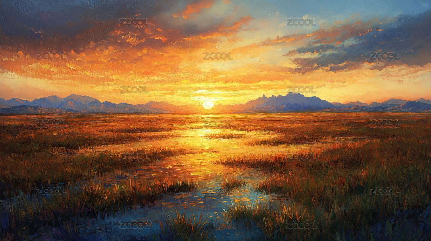 厚涂粗笔触印象派梦幻河边日落景观背景海报